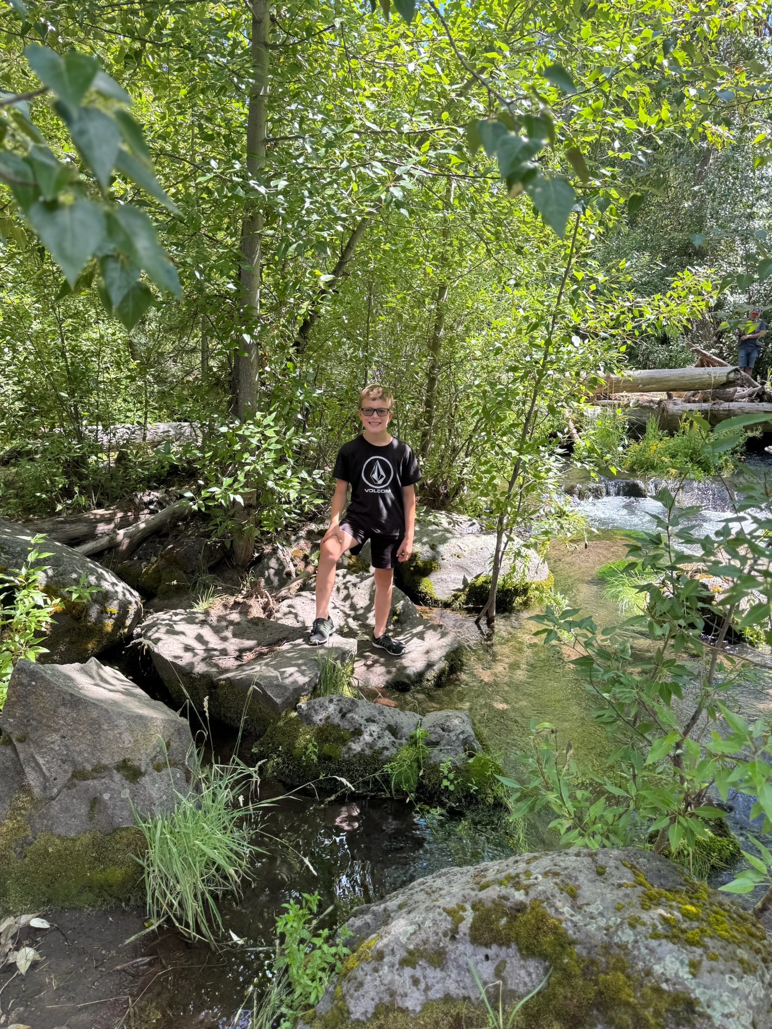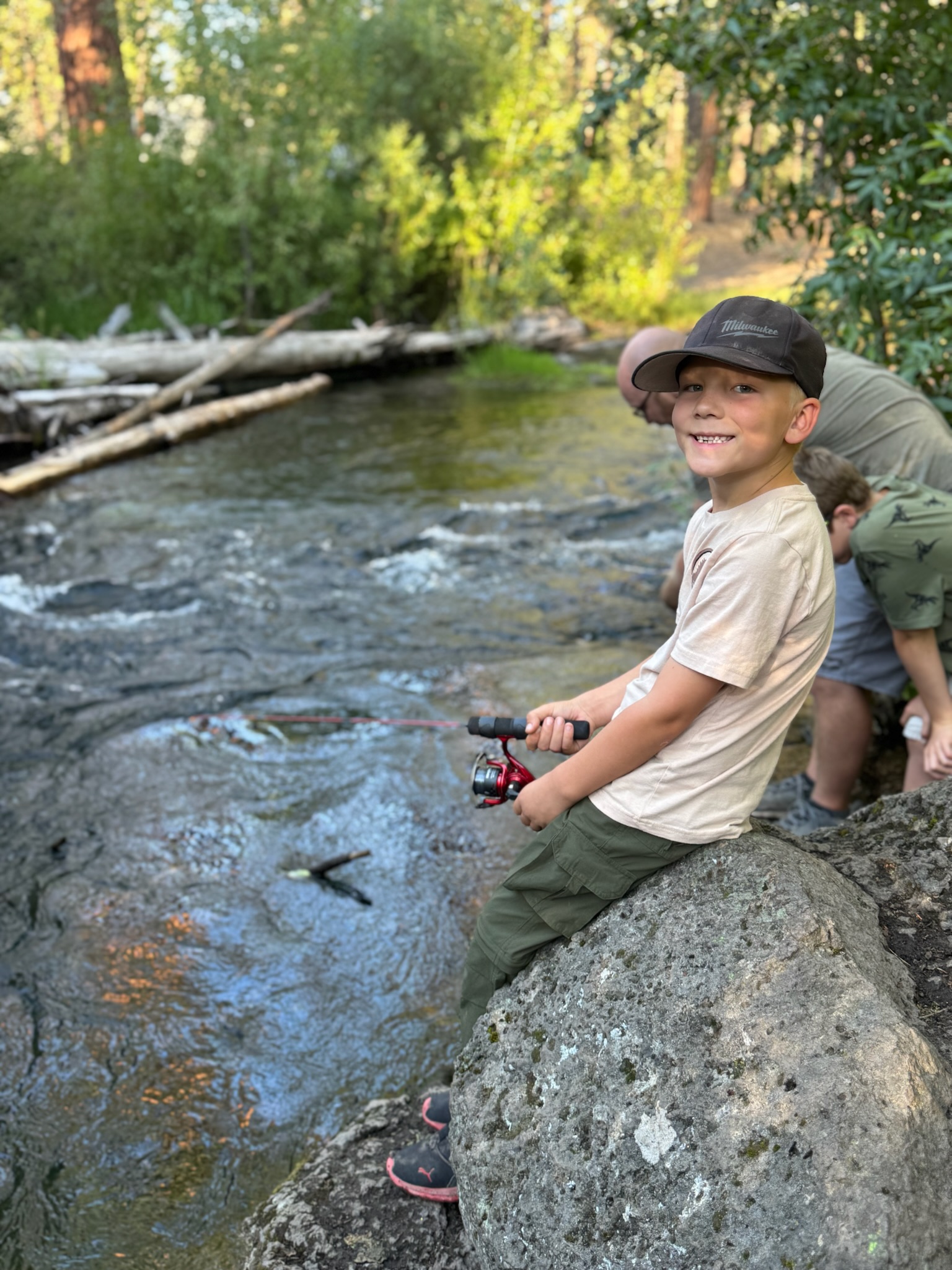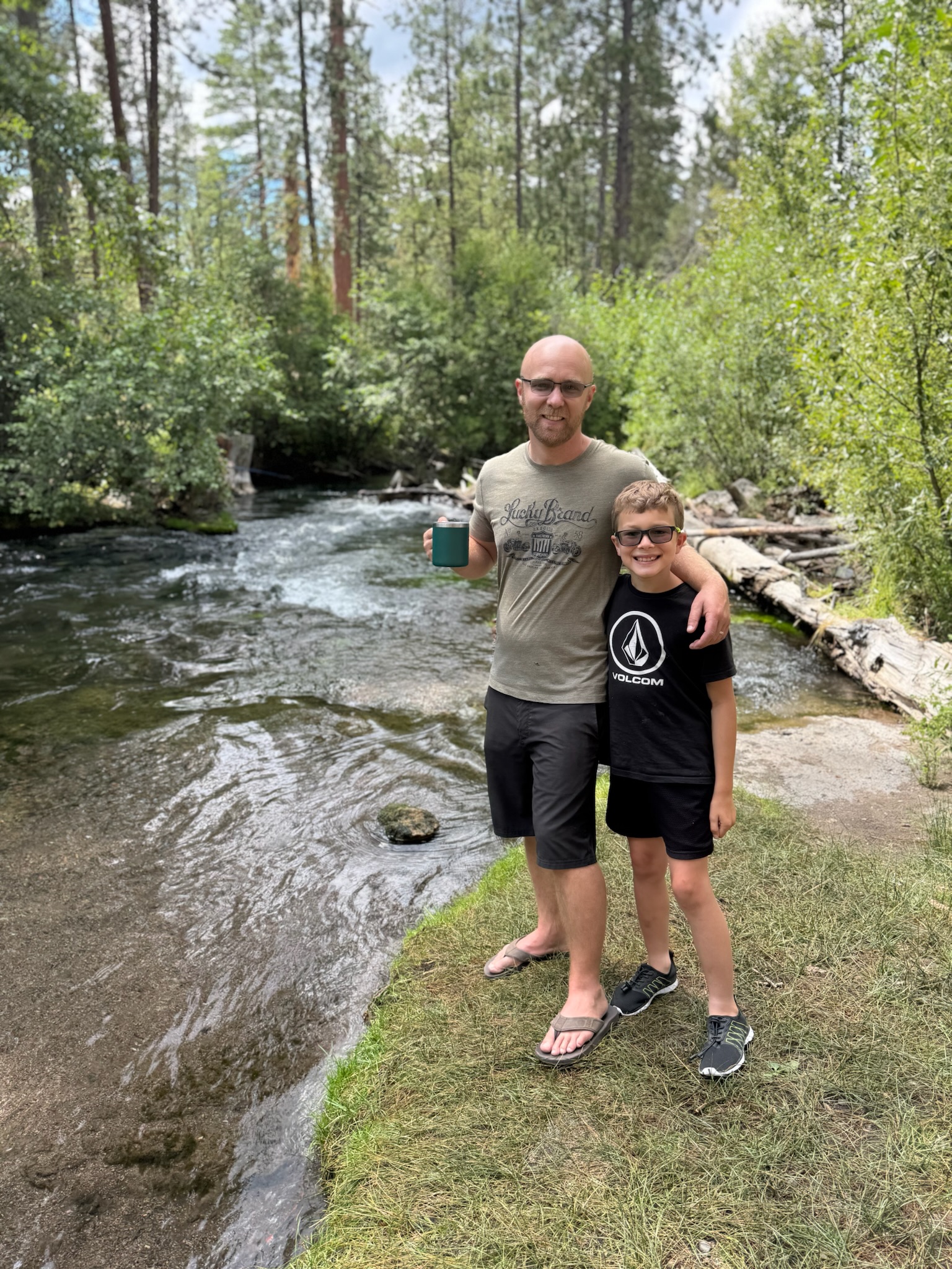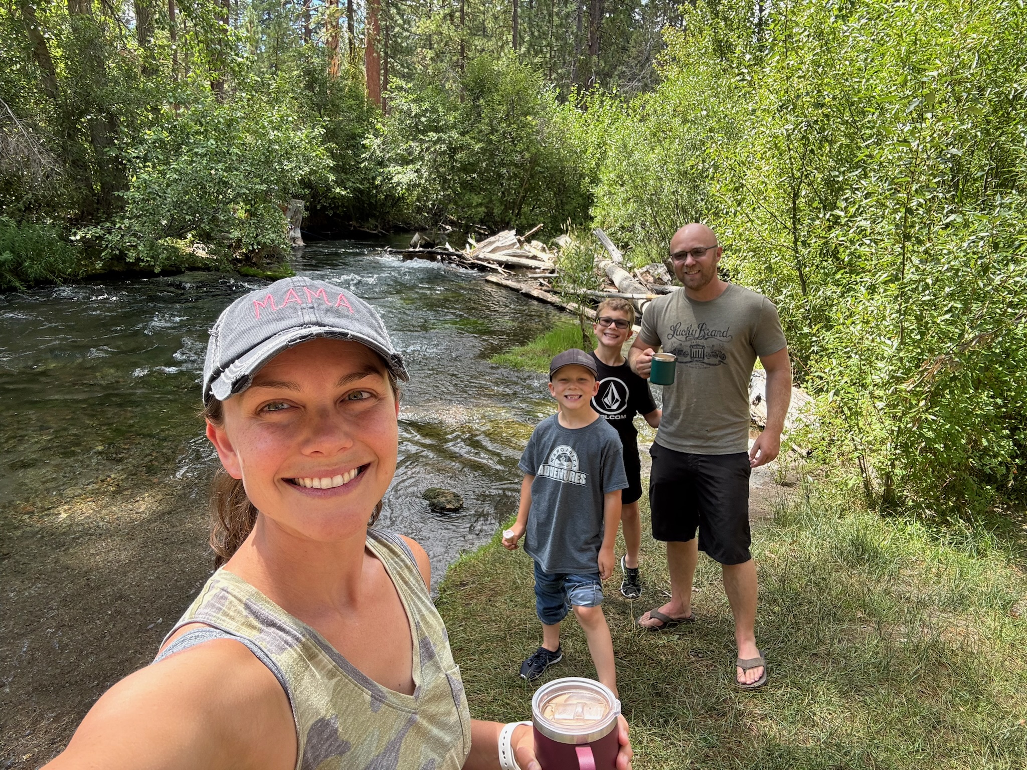 Even though it was a more crowded hike, the end was worth the site. It was sort of like a mini-Yellowstone with mud pots boiling and steaming out of the ground. It was weird passing by a flowing stream that felt like bath water to the touch! The trail led down to a manmade boardwalk and was a nice little walk through the steaming mud pots before going back up the mountain. It started raining on us on our hike back with thunderstorms in the distance. We didn’t mind though- it turned it into even more of an adventure! The kids passed out on the drive back down the mountain and back to camp. We finished our day with some fishing in Hat Creek, and even got to cook up some of that fish for dinner!
