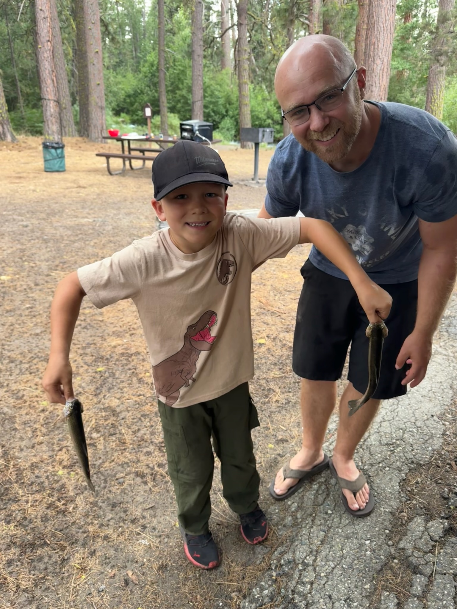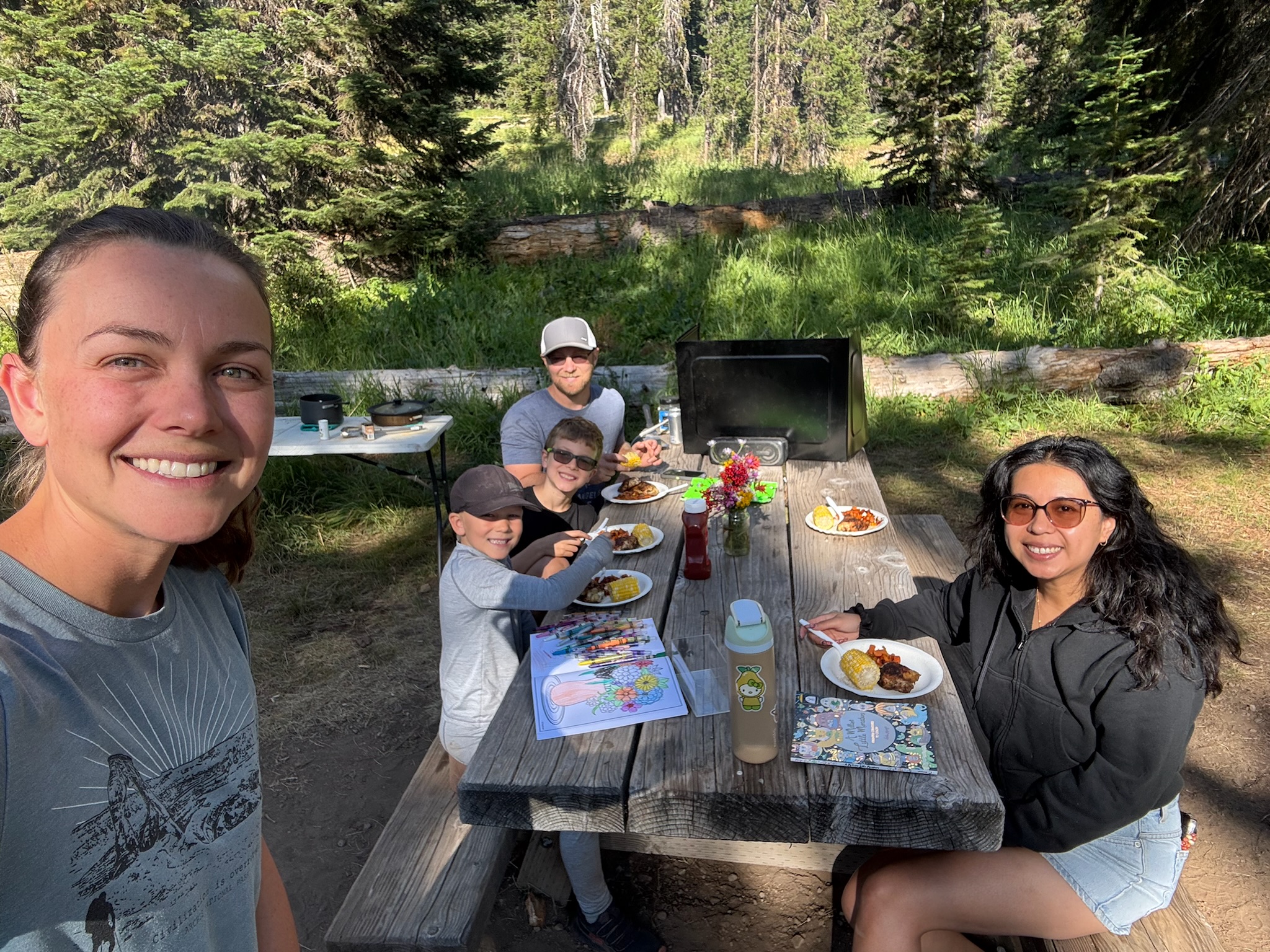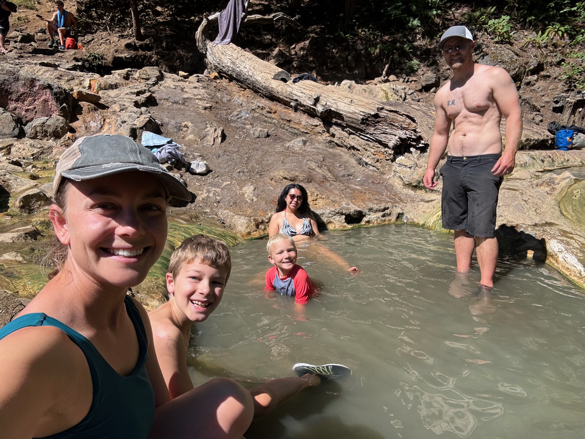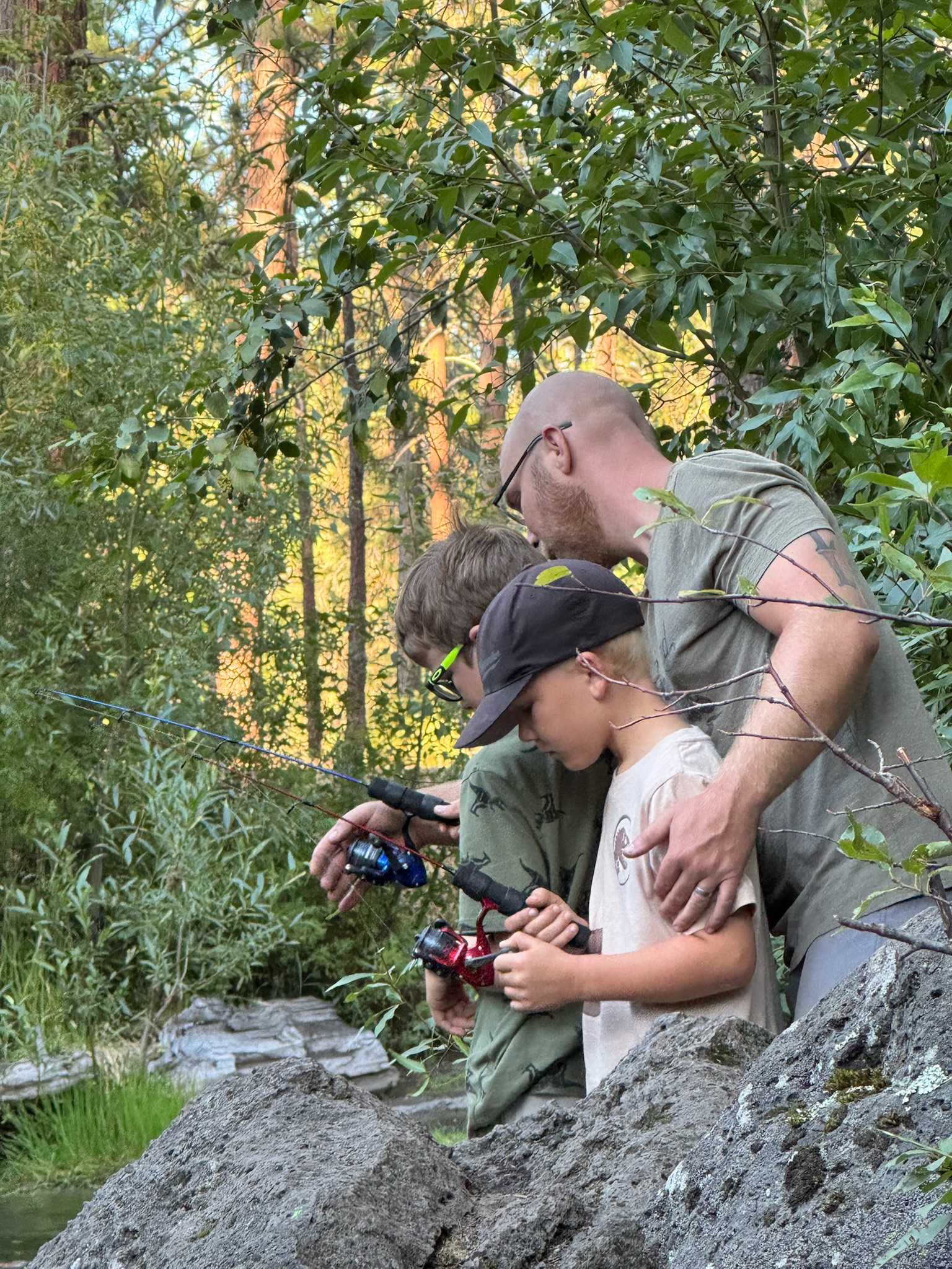 Even though it was a more crowded hike, the end was worth the site. It was sort of like a mini-Yellowstone with mud pots boiling and steaming out of the ground. It was weird passing by a flowing stream that felt like bath water to the touch! The trail led down to a manmade boardwalk and was a nice little walk through the steaming mud pots before going back up the mountain. It started raining on us on our hike back with thunderstorms in the distance. We didn’t mind though- it turned it into even more of an adventure! The kids passed out on the drive back down the mountain and back to camp. We finished our day with some fishing in Hat Creek, and even got to cook up some of that fish for dinner!