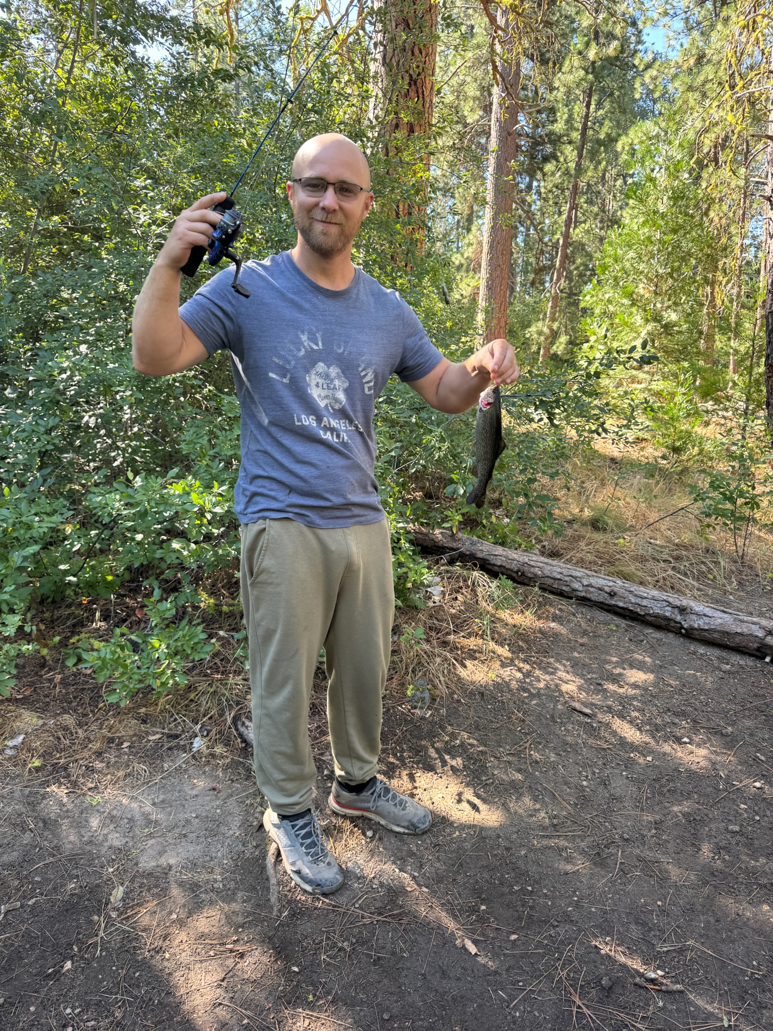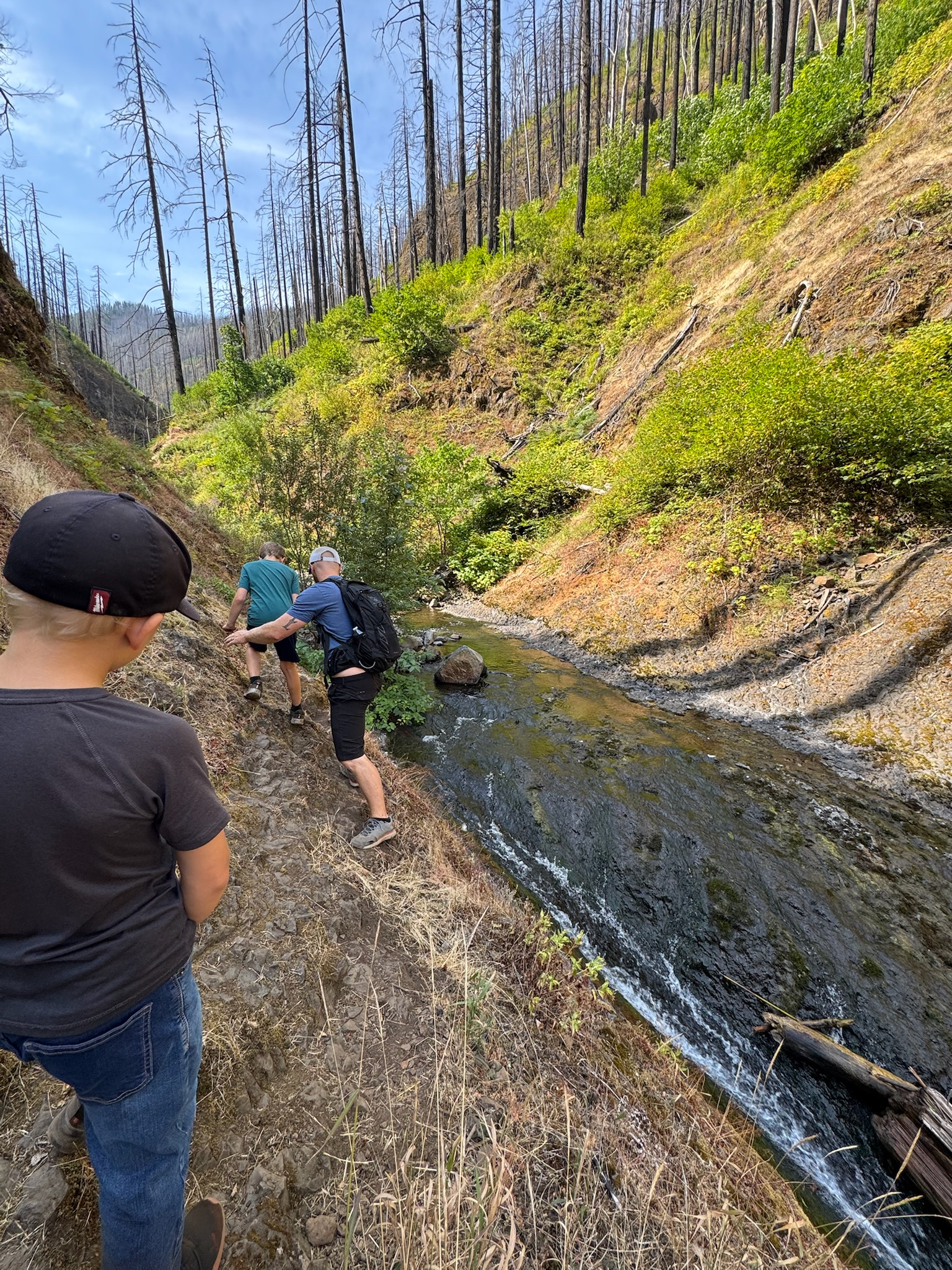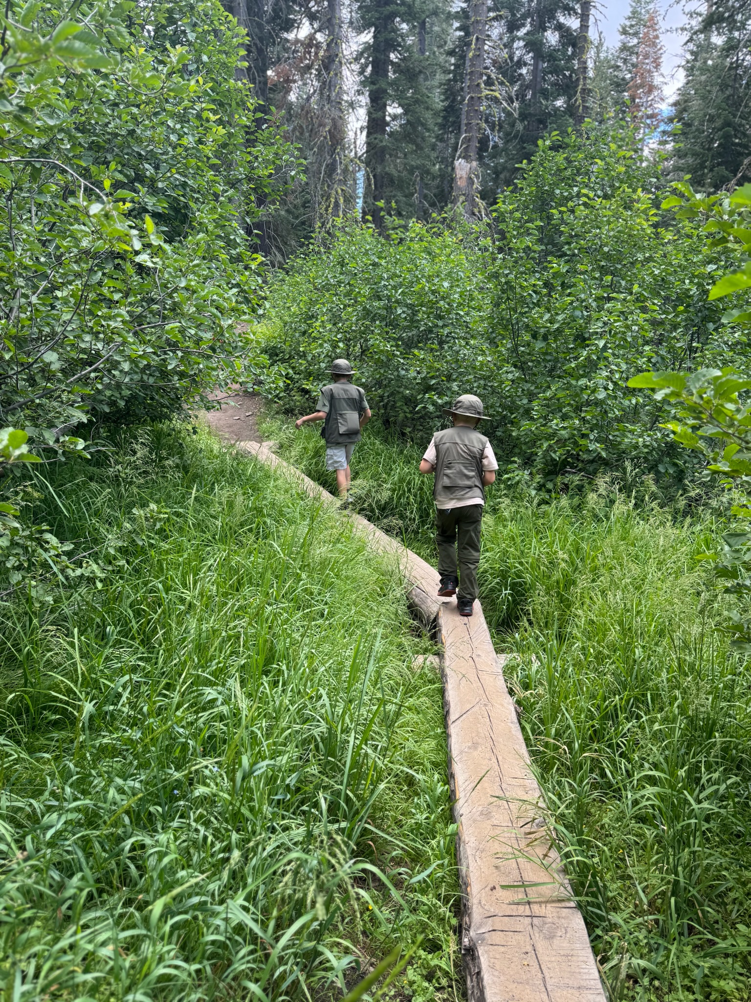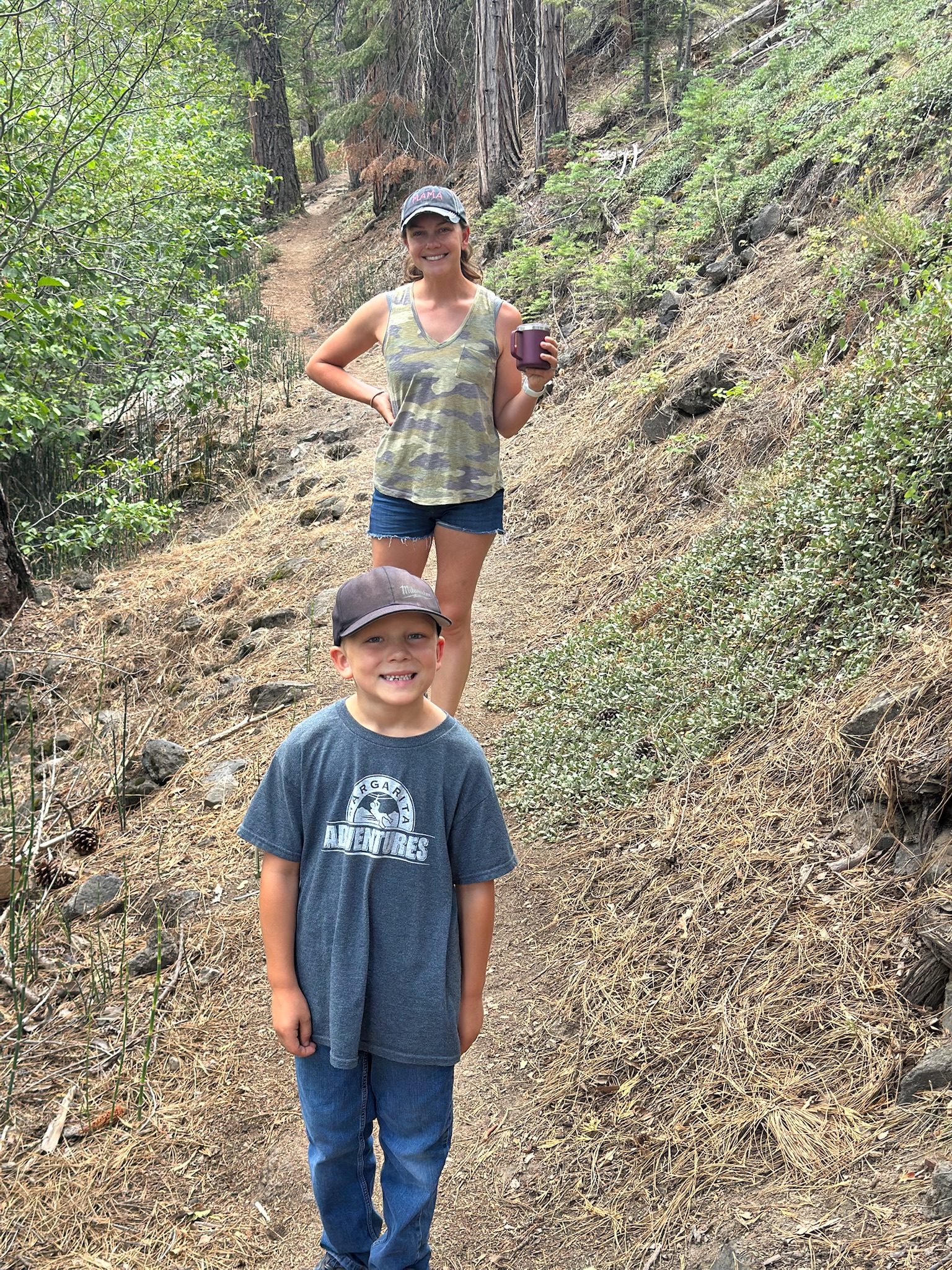 Even though it was a more crowded hike, the end was worth the site. It was sort of like a mini-Yellowstone with mud pots boiling and steaming out of the ground. It was weird passing by a flowing stream that felt like bath water to the touch! The trail led down to a manmade boardwalk and was a nice little walk through the steaming mud pots before going back up the mountain. It started raining on us on our hike back with thunderstorms in the distance. We didn’t mind though- it turned it into even more of an adventure! The kids passed out on the drive back down the mountain and back to camp. We finished our day with some fishing in Hat Creek, and even got to cook up some of that fish for dinner!