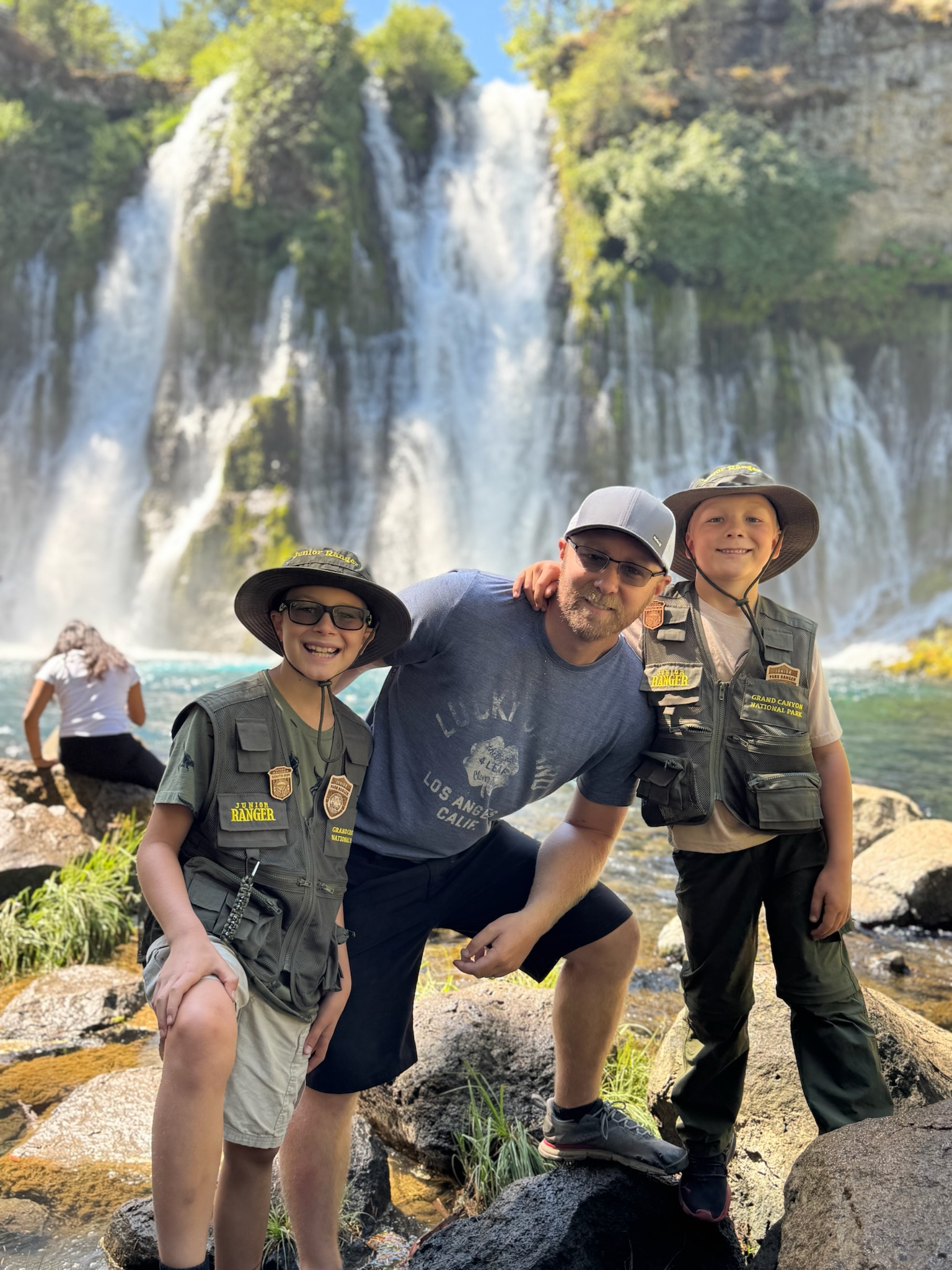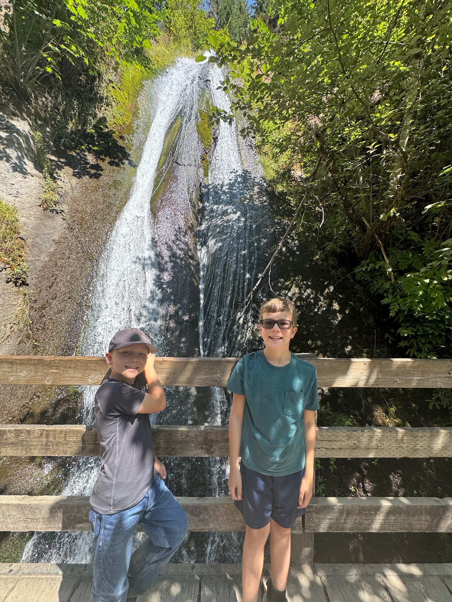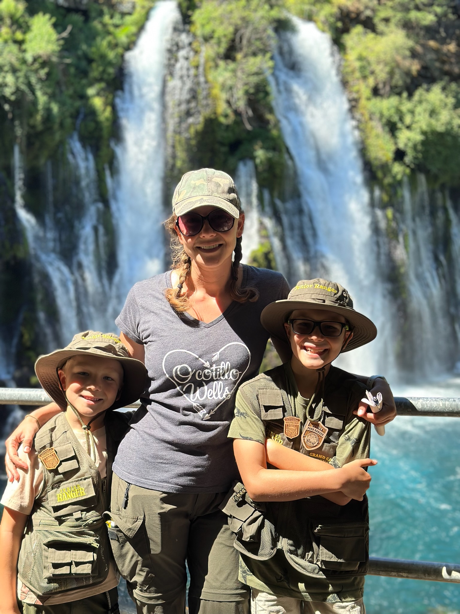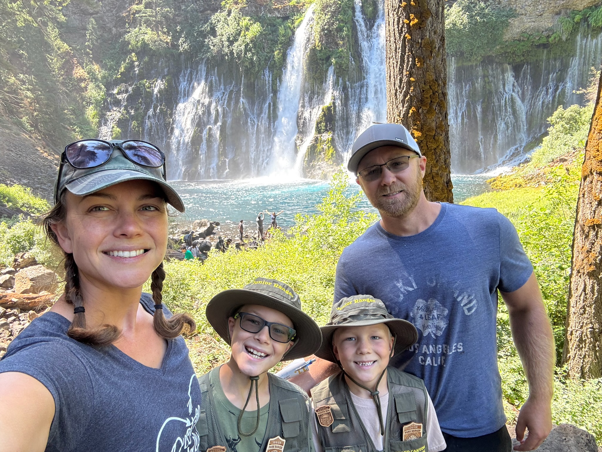 On our last full day in the Lassen Forest, we decided to drive about 30 minutes in the opposite direction of the national park and check out the Eighth Wonder of the World: Burney Falls. We entered the park, a $10 day fee, and parked by the visitor center where we picked up junior ranger books for the boys to complete. We were surprised by what we saw outside right away- the falls! Though beautiful, I can’t say we weren’t a little disappointed to see the main attraction right away instead of it being a rewarding end to a long hike. We walked down the paved pathway to the bottom of the falls. I can see why it was labeled as the eighth wonder of the world. The water comes out of the mountainside from many different spots and they all crash down into a deep crystal blue pool. The sight is stunning. Once you’re at the bottom of the falls, you hike back up away from the falls and then cross over the top of it.