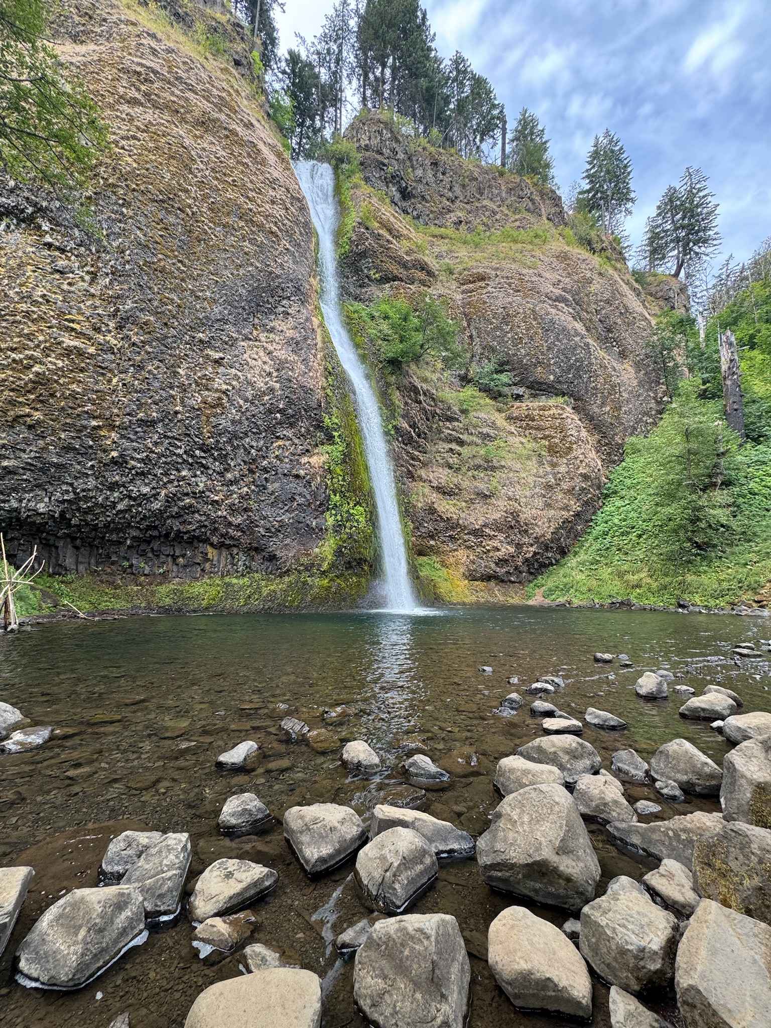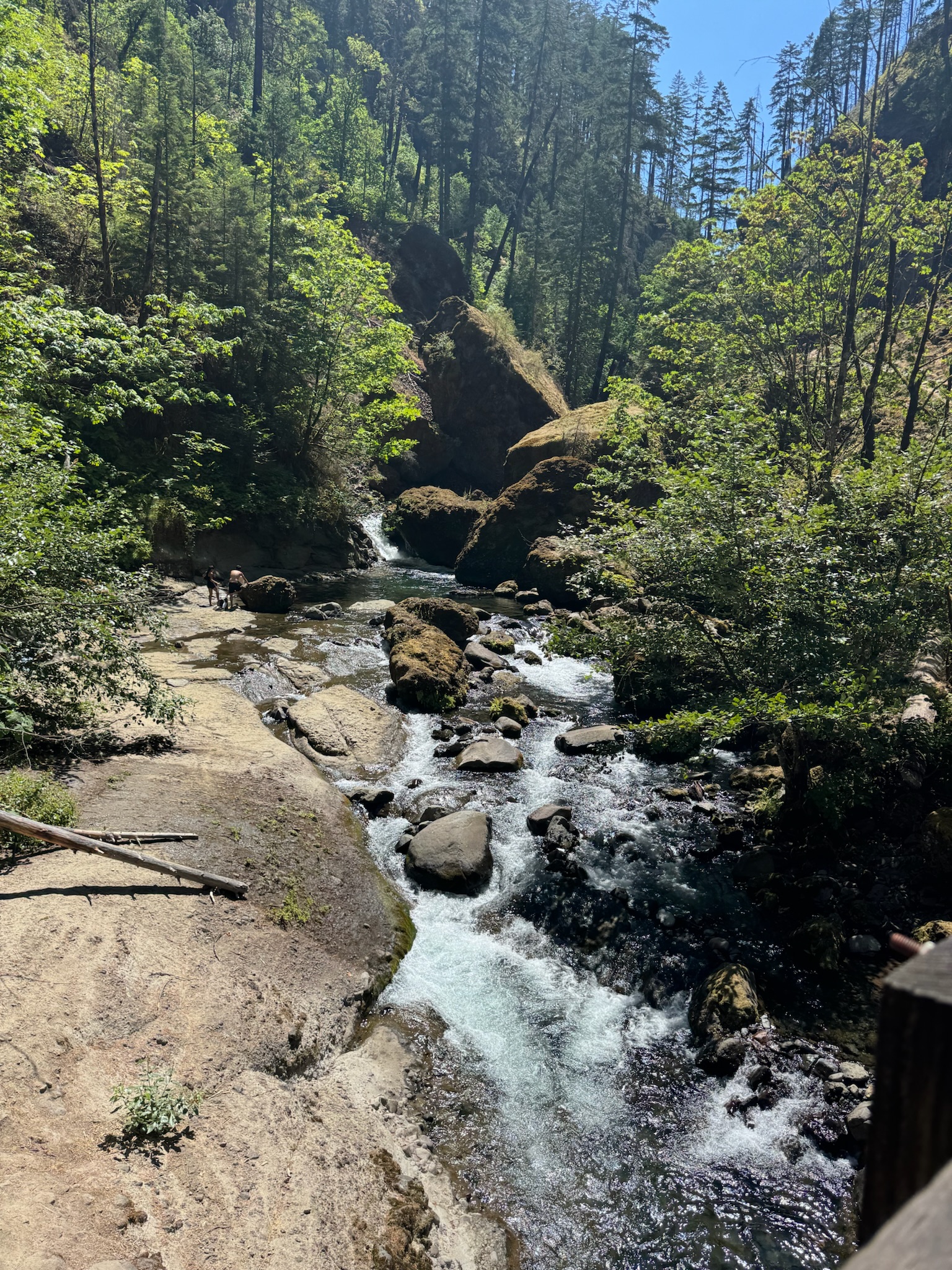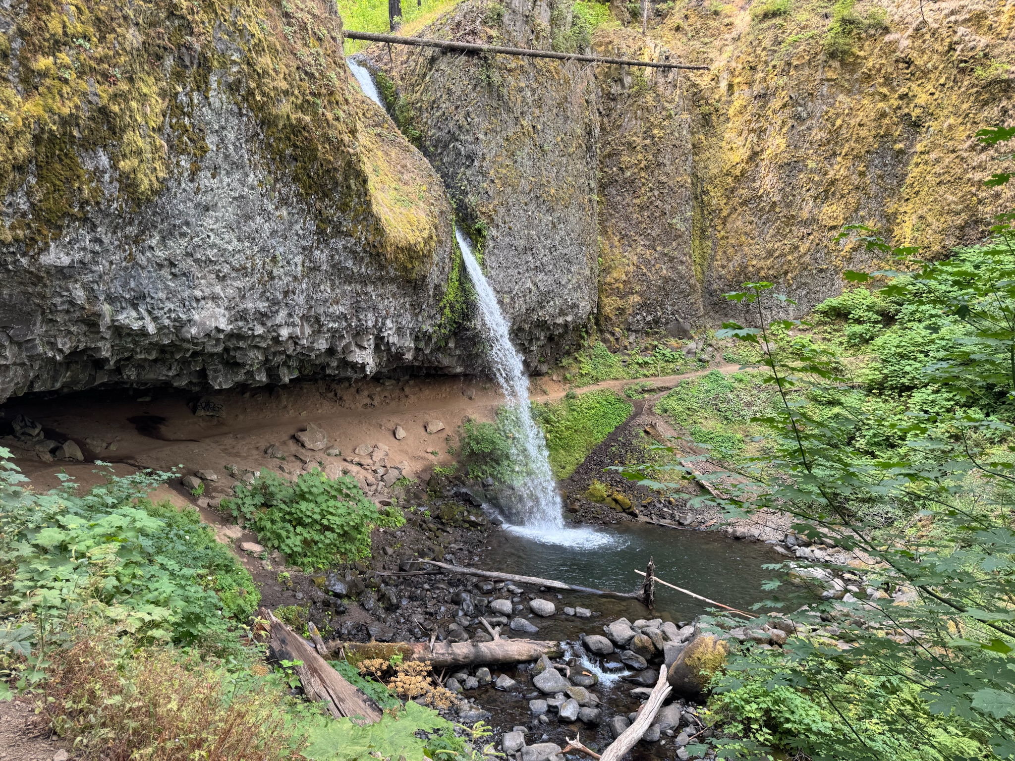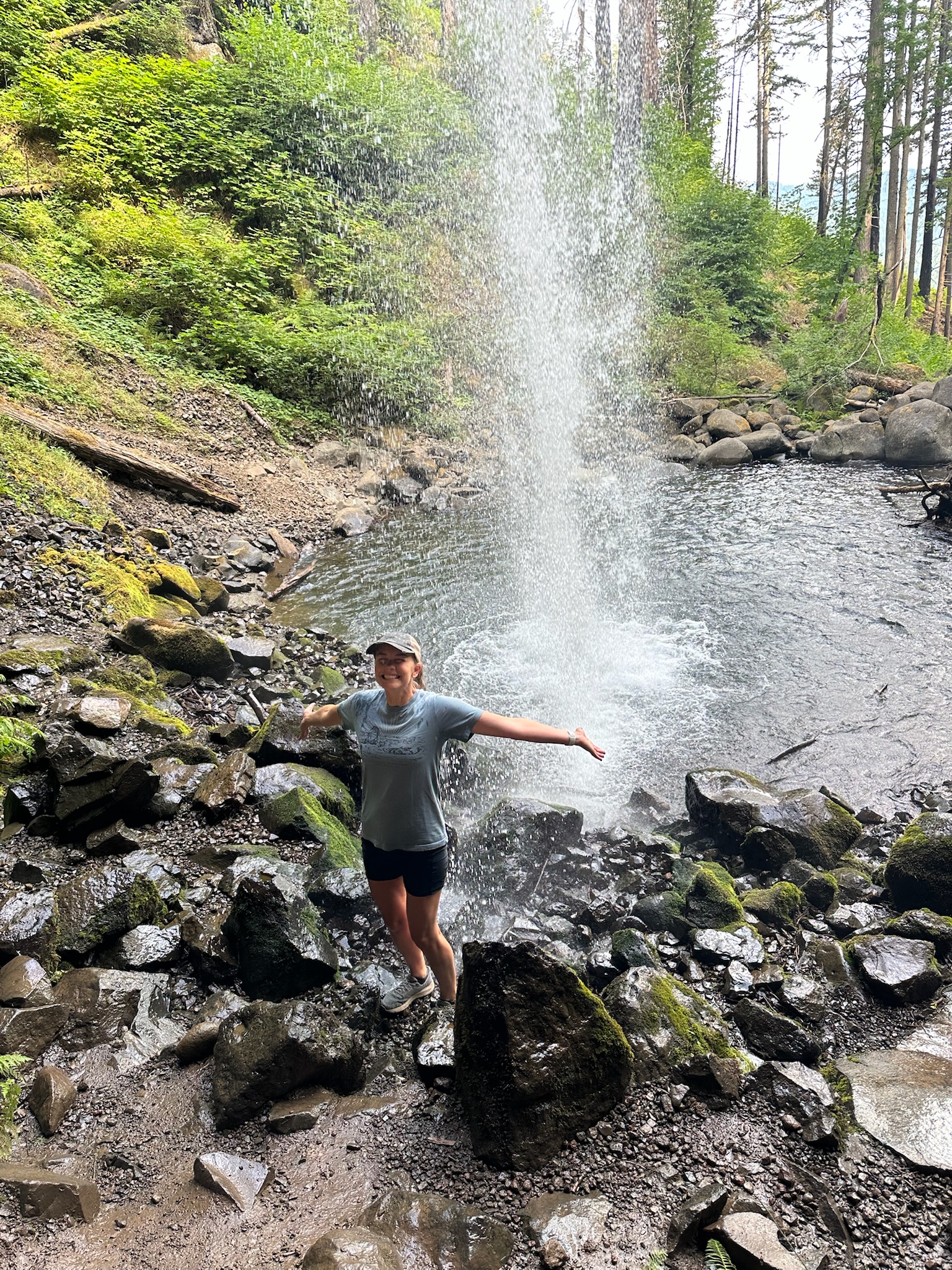 We drove a little further to hike Horsetail Falls, which ended up being coupled with Ponytail Falls so it was sort of a two-for-one deal! Ponytail Falls was very cool because you actually got to walk under the rock, behind the waterfall. The upper end of the trail has a lookout with a beautiful view of the Columbia River. It’s crazy to think on the other side of that river is a different state than where we were standing! But we didn’t step foot in Washington on this trip, even though it was so close we could see it!