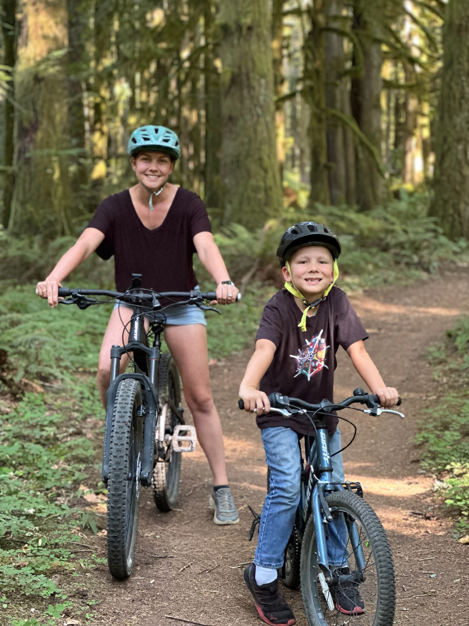 Once we were back at camp, Dustin and I decided to go for a ride, me on my bike, Dustin on his One Wheel, around the campground. We discovered a hidden trail through one of the campsites that was so cool we had to go back to get the kids! They joined us on their bikes and we all took off for this trail. It was still daytime and the sun was shining, but this trail was in such a dense forest that it was dark inside. We were surrounded by trees and everything green: ferns, moss, ivy, trees, and bushes. It felt like a scene right out of Jurassic Park!