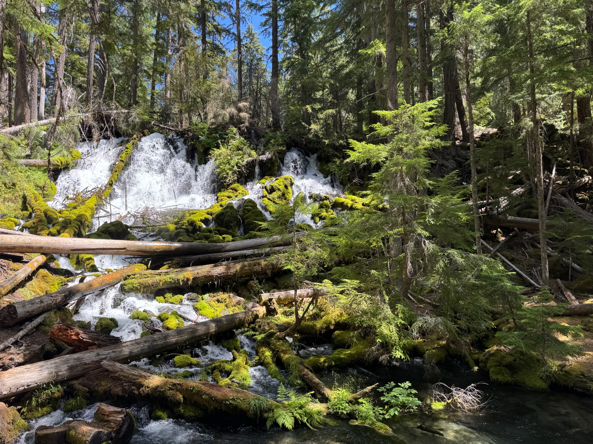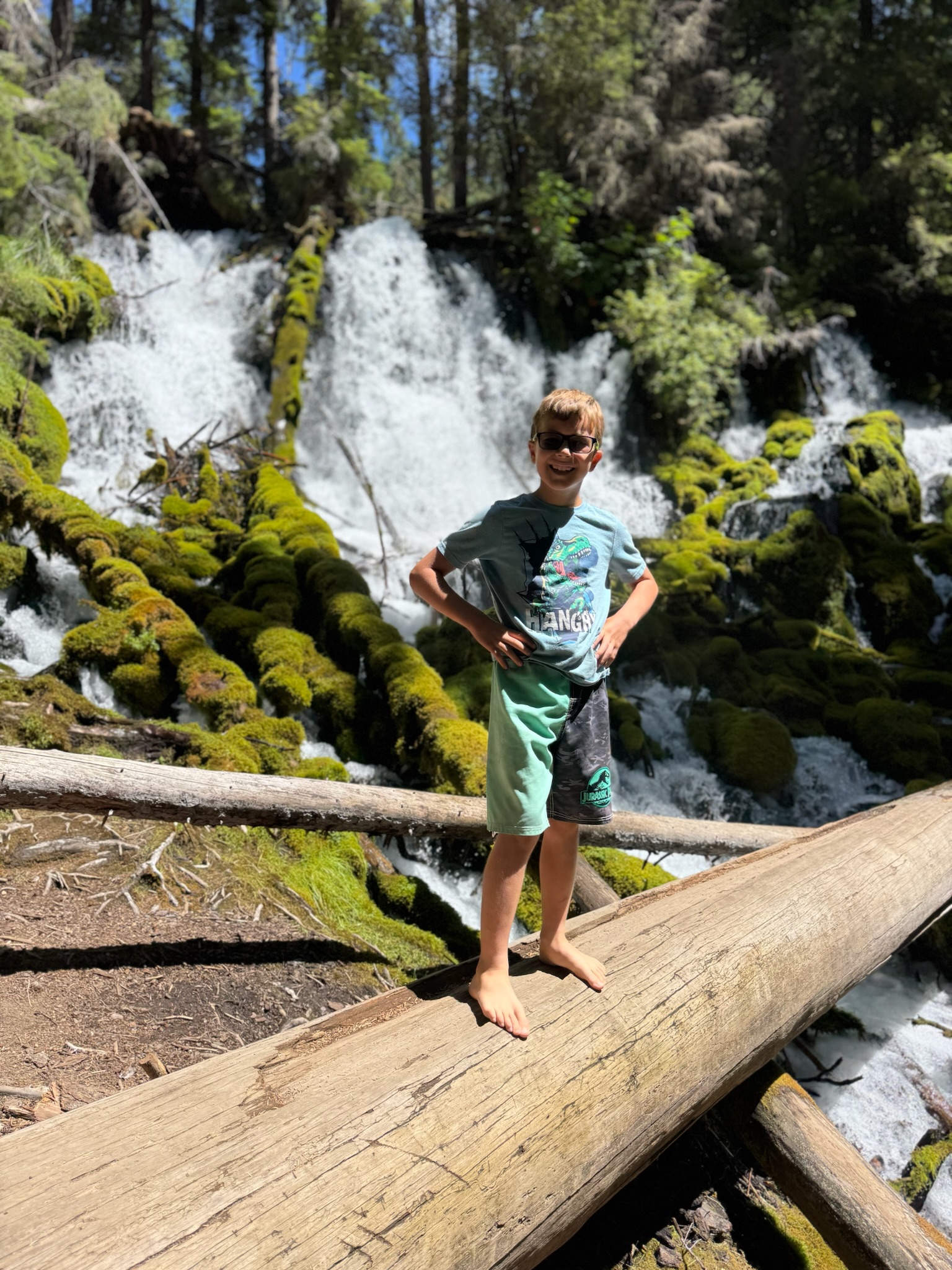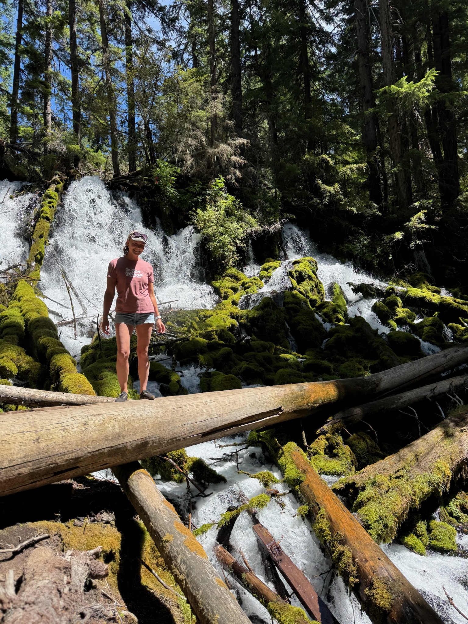 On our way back towards camp, we saw another sign for Clearwater Falls and took a little detour to check it out. Even though this waterfall didn’t come up as a popular hit on my google search, it was just as beautiful as any of the other waterfalls we hiked to in Oregon. Also being lesser known, there was no one else around this waterfall which made the scene that much more peaceful. There were fallen tree trunks spanning across the fall and most were covered in moss. We walked above the falls where the water was much more gentle and formed a shallow pool. Poor Jax fell into the icy water while attempting to cross on a fallen log. Luckily the water was shallow, but again, so cold it was painful! We noted campsites in the area and thought this would be a really cool area to camp in, right near the waterfall!