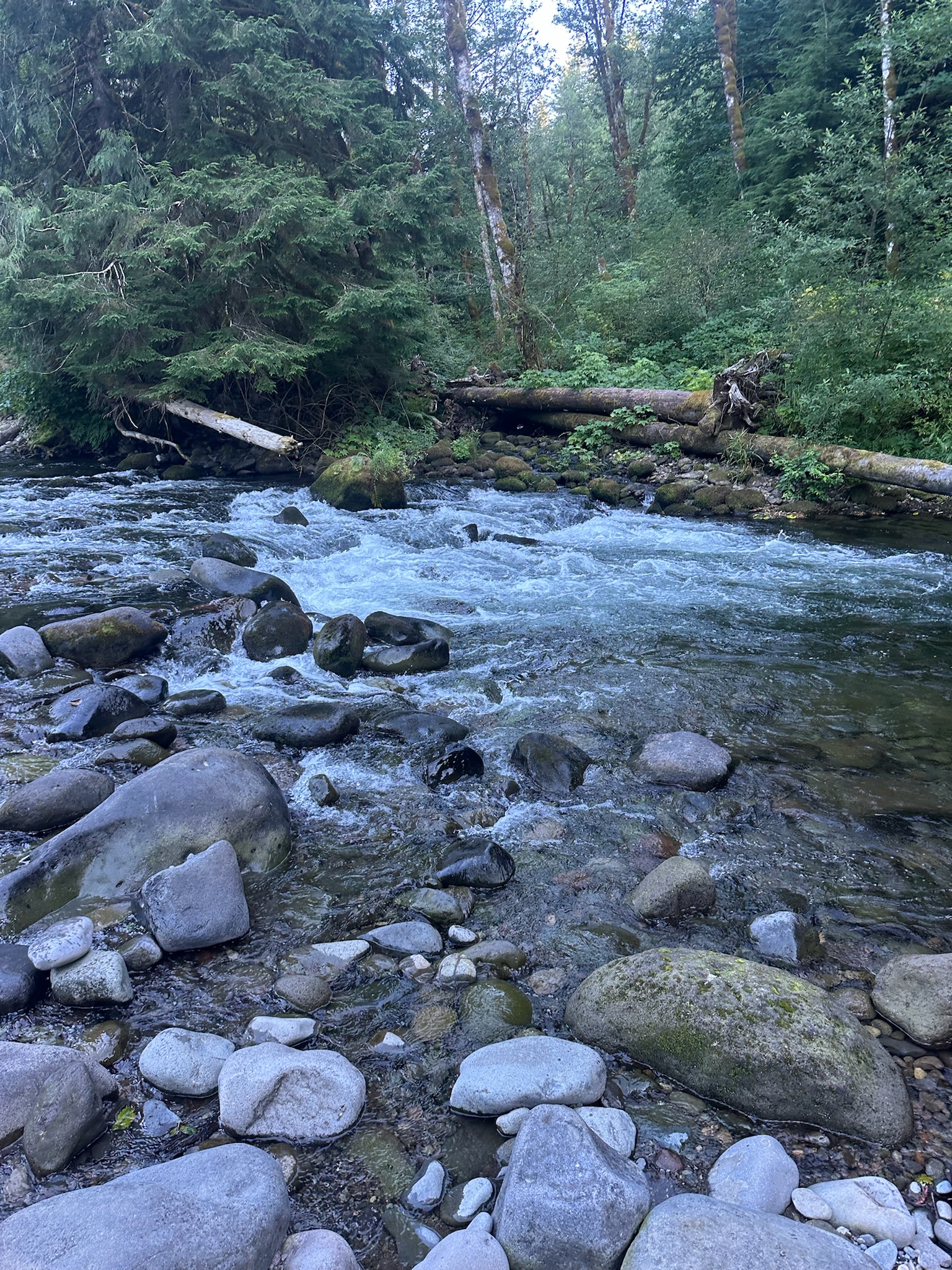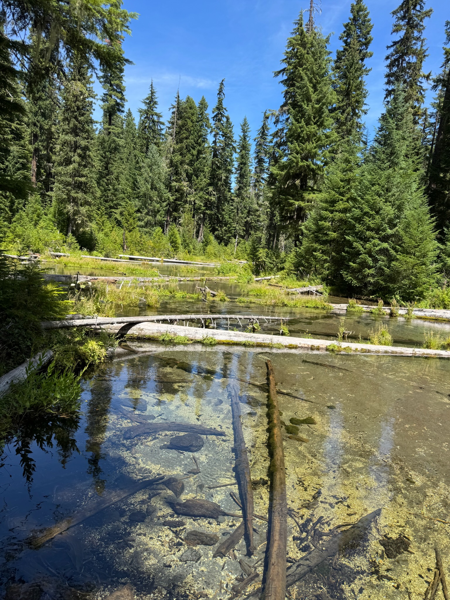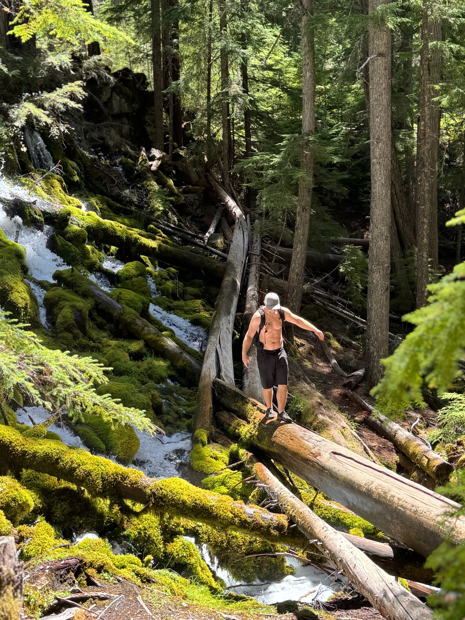 On our way back towards camp, we saw another sign for Clearwater Falls and took a little detour to check it out. Even though this waterfall didn’t come up as a popular hit on my google search, it was just as beautiful as any of the other waterfalls we hiked to in Oregon. Also being lesser known, there was no one else around this waterfall which made the scene that much more peaceful. There were fallen tree trunks spanning across the fall and most were covered in moss. We walked above the falls where the water was much more gentle and formed a shallow pool. Poor Jax fell into the icy water while attempting to cross on a fallen log. Luckily the water was shallow, but again, so cold it was painful! We noted campsites in the area and thought this would be a really cool area to camp in, right near the waterfall!