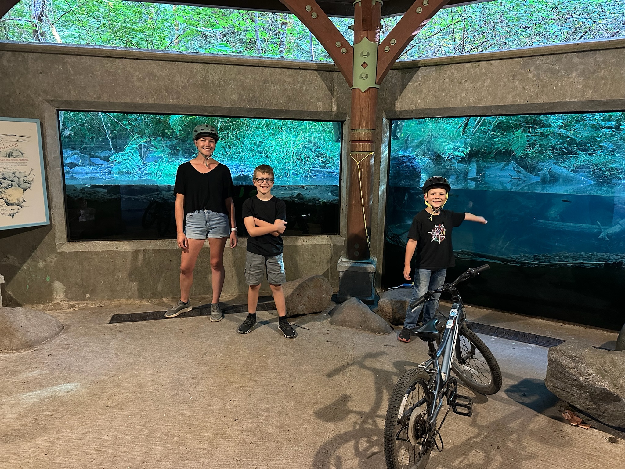 The trail winded, up and down, through the trees until we found a segway that led out to the Salmon River. We parked our bikes (and One Wheel) and walked along the river where we spotted some crawdads and did a little rock hopping around the water. Then we got back on our bikes and started heading back to camp when we saw a sign for an underwater viewing area. We decided to check it out and were surprised to find, in the middle of the forest, a man-made viewing area that allows you to see the wildlife under the surface of the Salmon River! It was like a little mini aquarium! There wasn’t a whole lot of action happening underwater at the time, but it was still a very cool and unexpected find. We rode back to camp and had a relaxing last night.