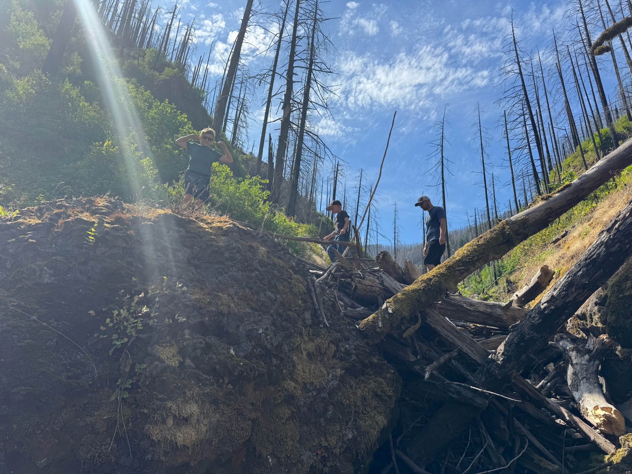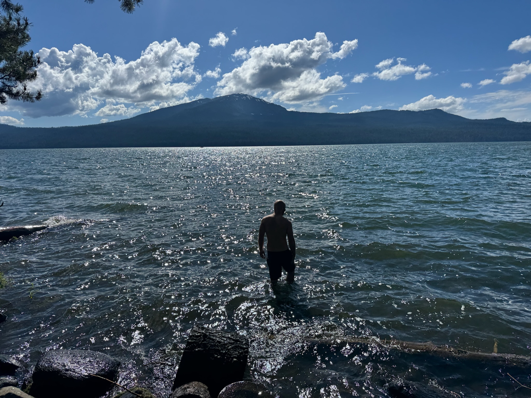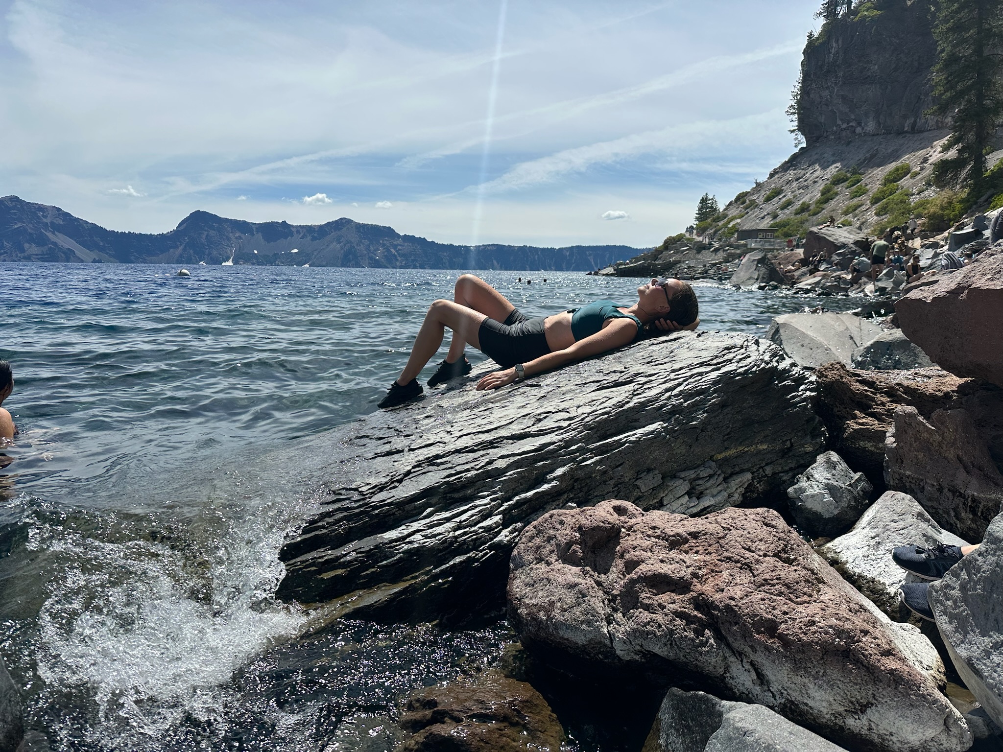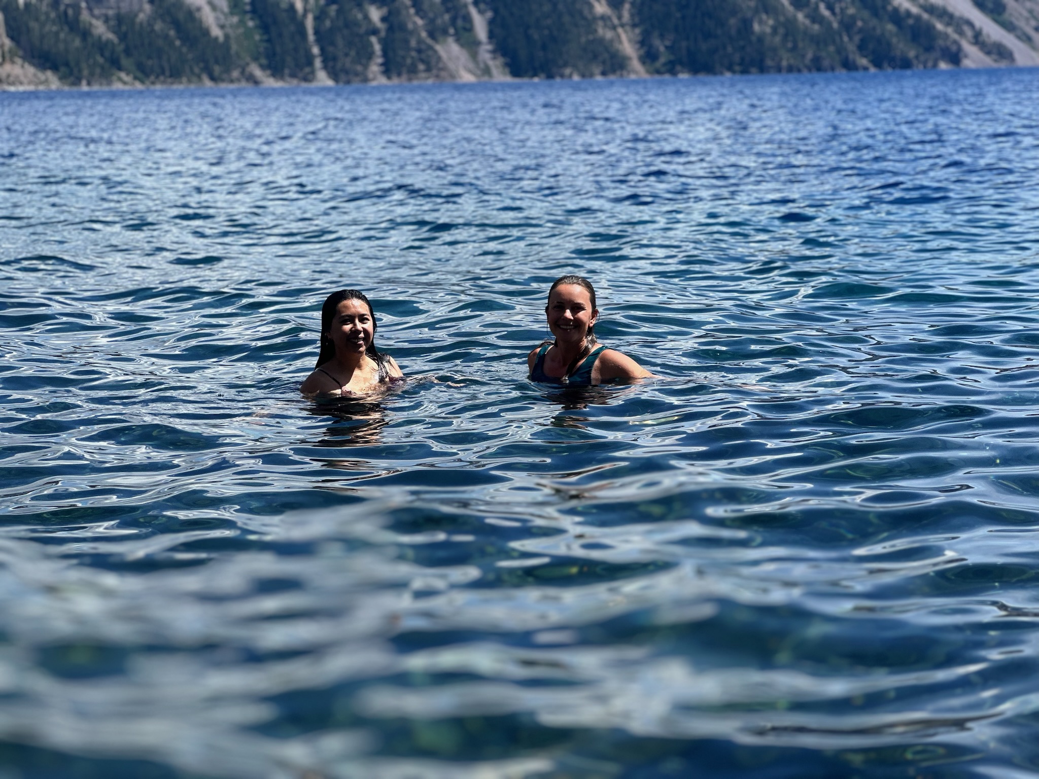 We finally made it to the trailhead and continued to walk the mile down the mountain, a 700 foot descent, down to the water. There were many, many people on this trail and around the rocks lining the shoreline at the bottom. We spent a little time finding an open spot to lay down our clothes and dip into the water. The water was so, so cold, but we were determined not to come all the way down here and not swim in Crater Lake! We finally plunged in and swam the lake. It’s hard to explain, but the water felt so good and clean! It was very different than swimming in any other lake and the coldness wasn’t an issue for long. It soon felt very refreshing. We all swam for a bit and then had a snack on the rocks before climbing back up to the top of the mountain, past the butterflies, and back to our camp at Diamond Lake.
