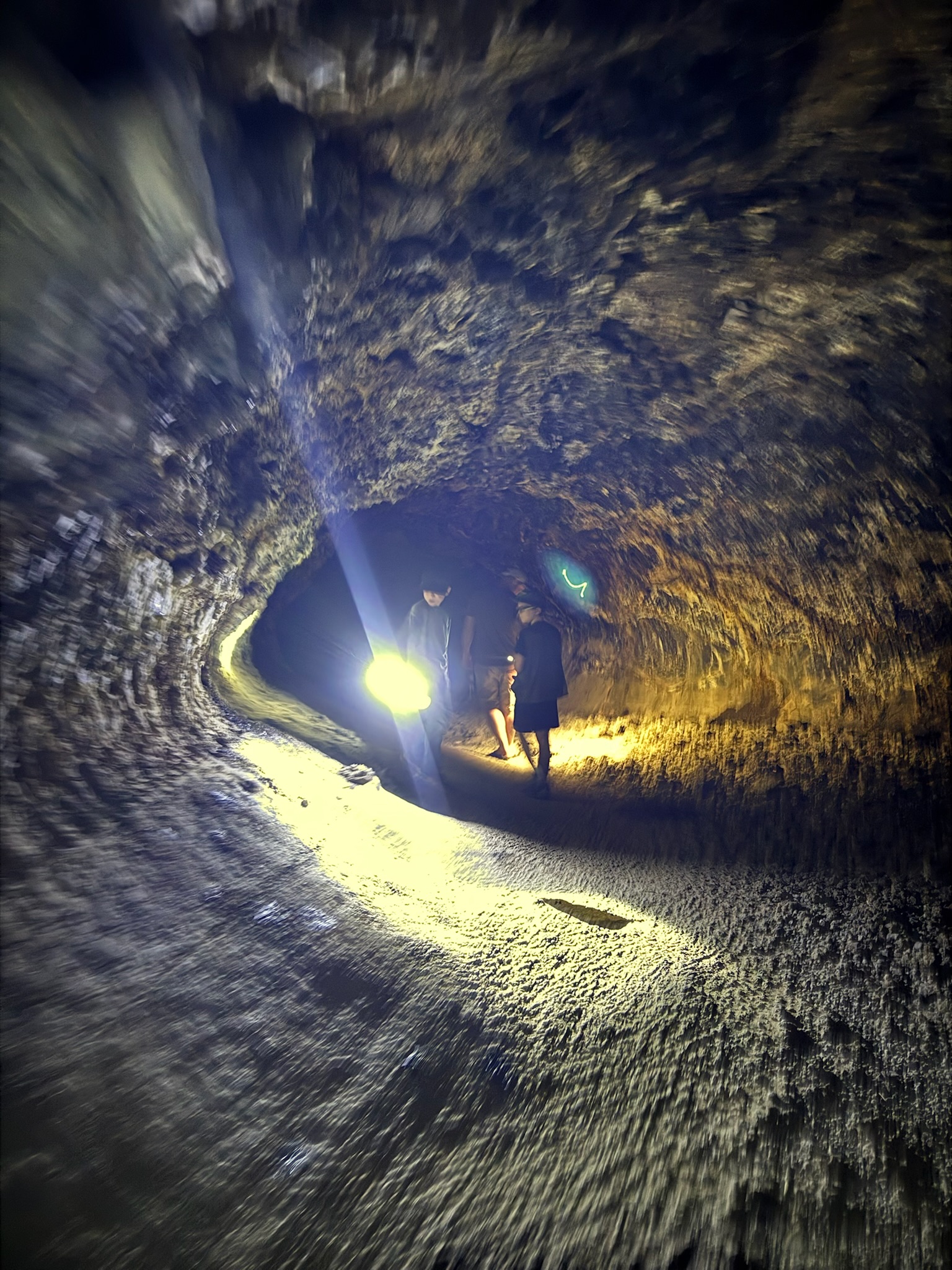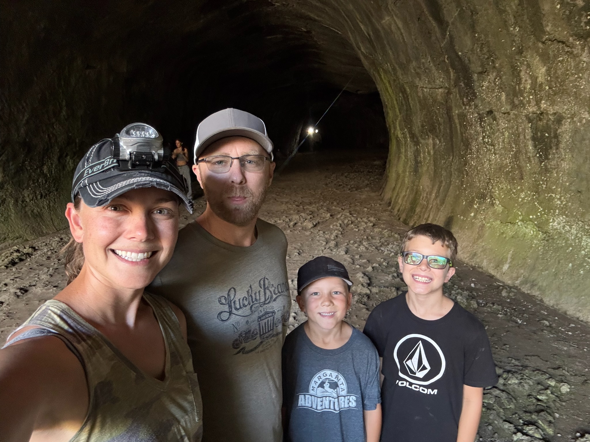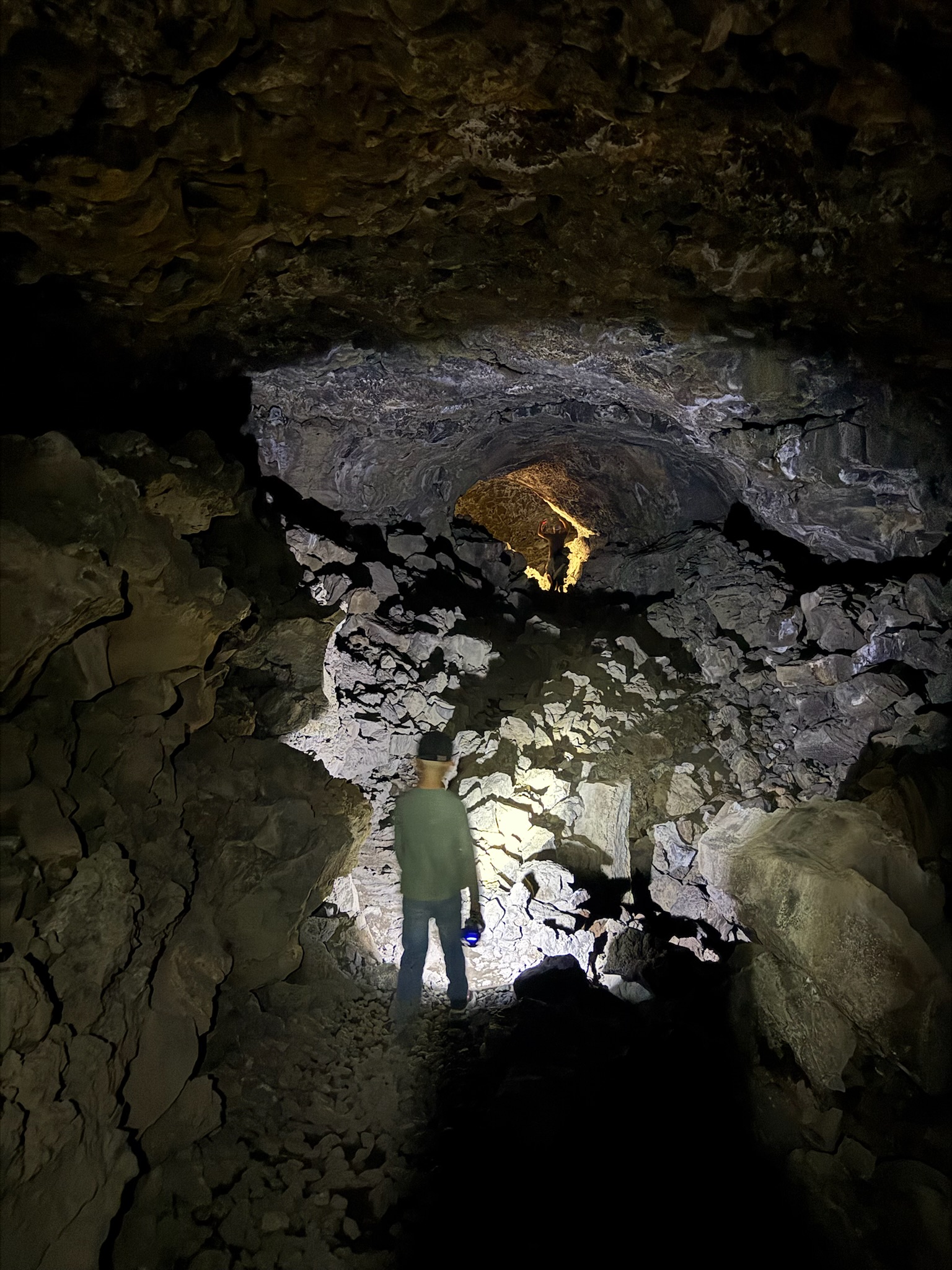When we finally made it to our intersection, there were two signs going in opposite directions. The sign to the left pointed to “Campground” while the sign to the right pointed to “Cave”. I knew our camp was called “Cave Campground” so my brain read cave and I navigated for Dustin to turn right towards “Cave”. This was the wrong choice. Cave campground gets it’s name because it is right across the road from Subway Cave, a free to enter, .3 mile underground lava tube. And the destination we just turned toward. Good thing Dustin is good with maneuvering our long trailer because it was a short road that led to a small parking lot and a very tight roundabout at the end. Whoops! Nonetheless, we made it out and across the road to our actual campground (go figure, the side labeled campground!)