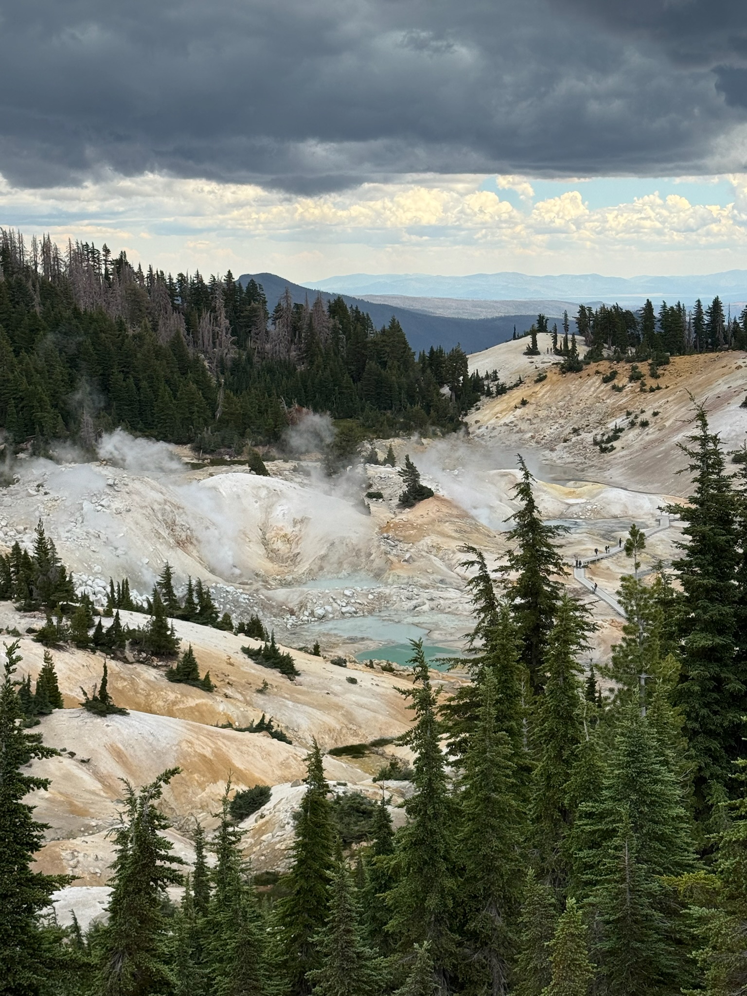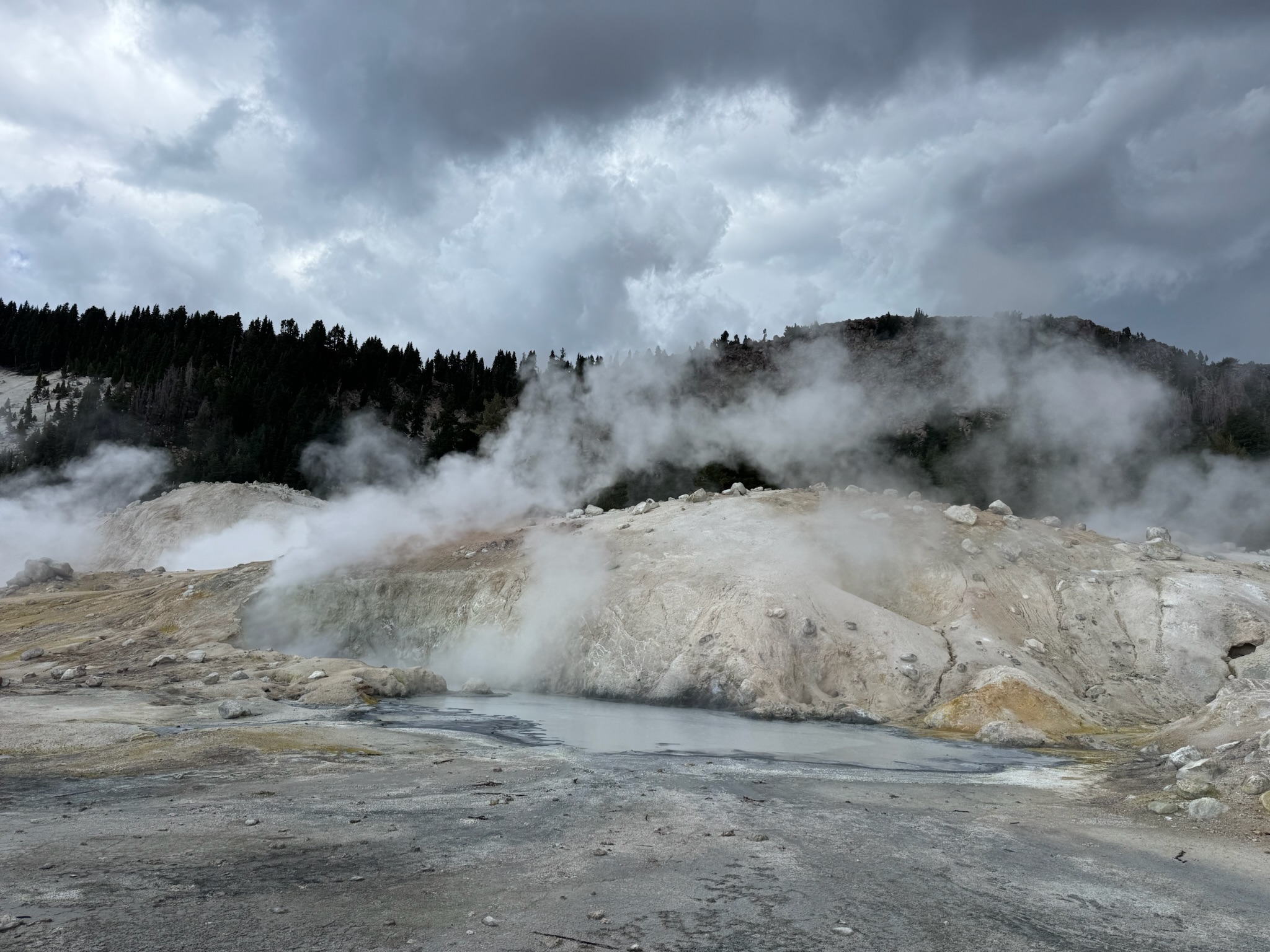 Bumpass Hell was another 3-mile hike roundtrip, but we were able to convince the kids it would be worth it with its bubbling mud pits! The hike was a little more treacherous, being up a mountain with a drop on one side, but nothing too difficult or dangerous. We noticed right away that this was definitely the more popular destination as we had other hikers walking along with us and others passing us on their way back the entire hike. The kids kept asking if we were almost there, but they kept forgetting the name of it and we ended up renaming it as “The Devil’s Butthole” (#boymom). But we could tell when we were getting close to the end by the smell of sulfur in the air and we could start to see steam coming from down the mountain through the trees.