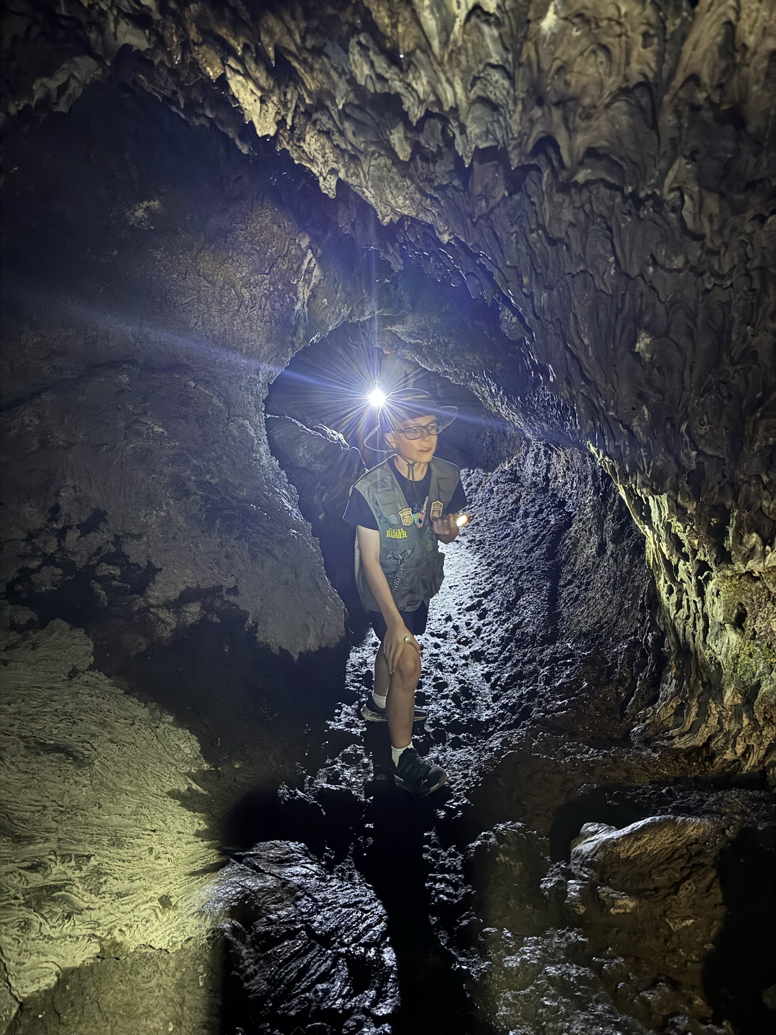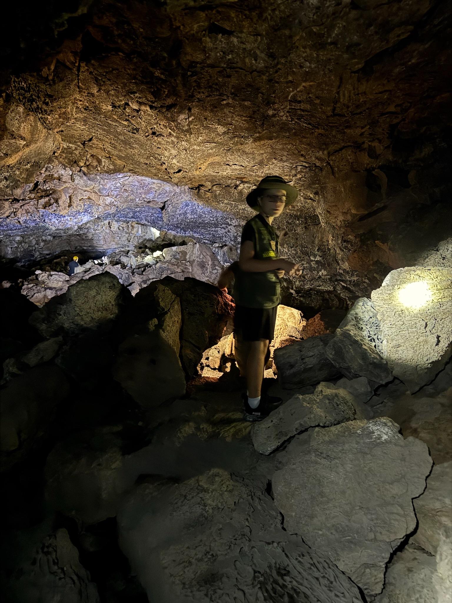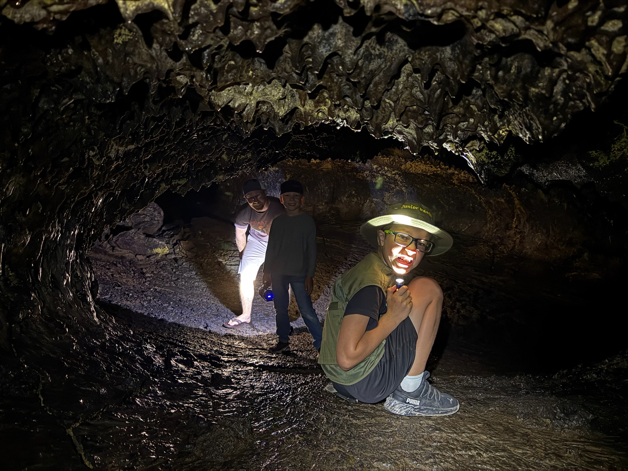 Once we made it to camp, we decided we had to go check out the cave! Another quarter-mile walk across the road led us back over to Subway Cave where we got to explore the cold, dark lava tube. It was a short walk through the cave, only about .3 miles to the other side where you could exit the cave and continue hiking outside, or turn back and walk back through the cave and out the way you entered. Of course, we all wanted to walk back through the cave because that was way cooler than being above ground! One thing to remember with lava tubes and caves, bring a jacket and a flashlight because it does get cold underground and very dark! We finished our travel day with dinner by the campfire and a homemade cobbler with the fresh black berries we picked in Lotus.