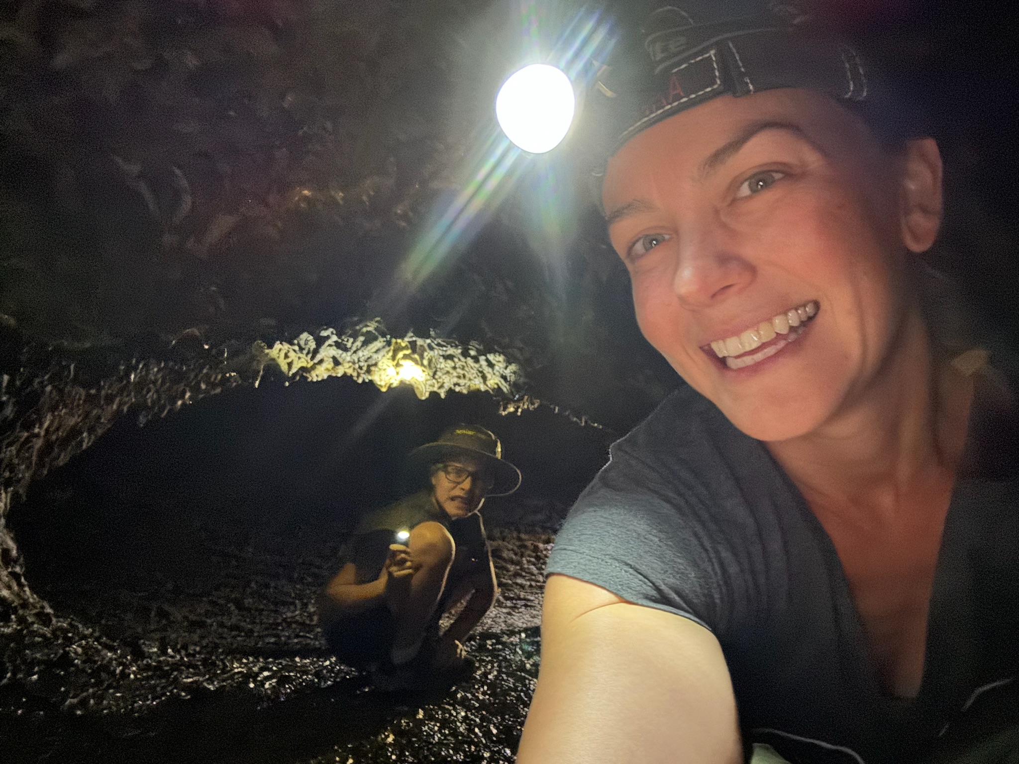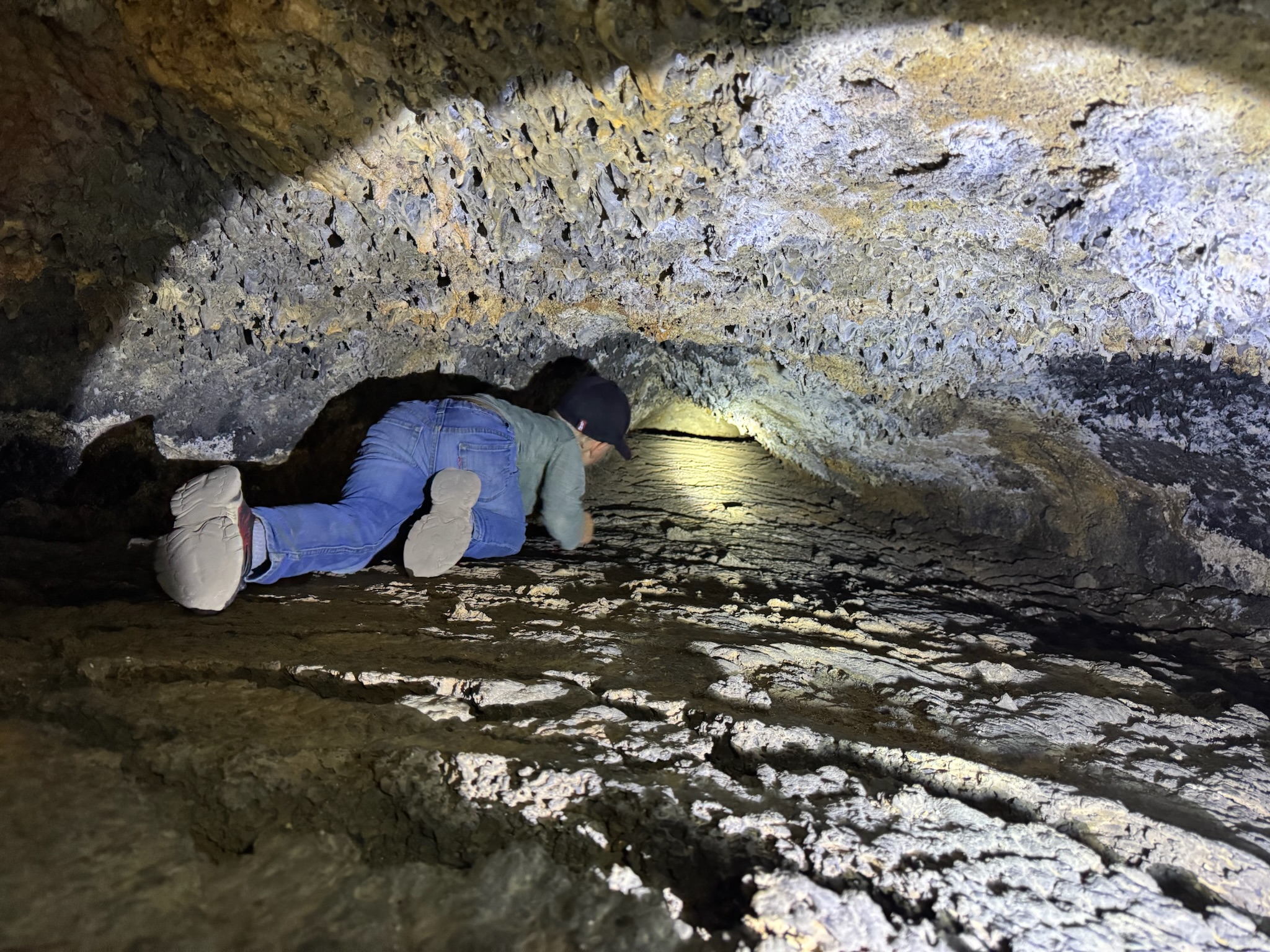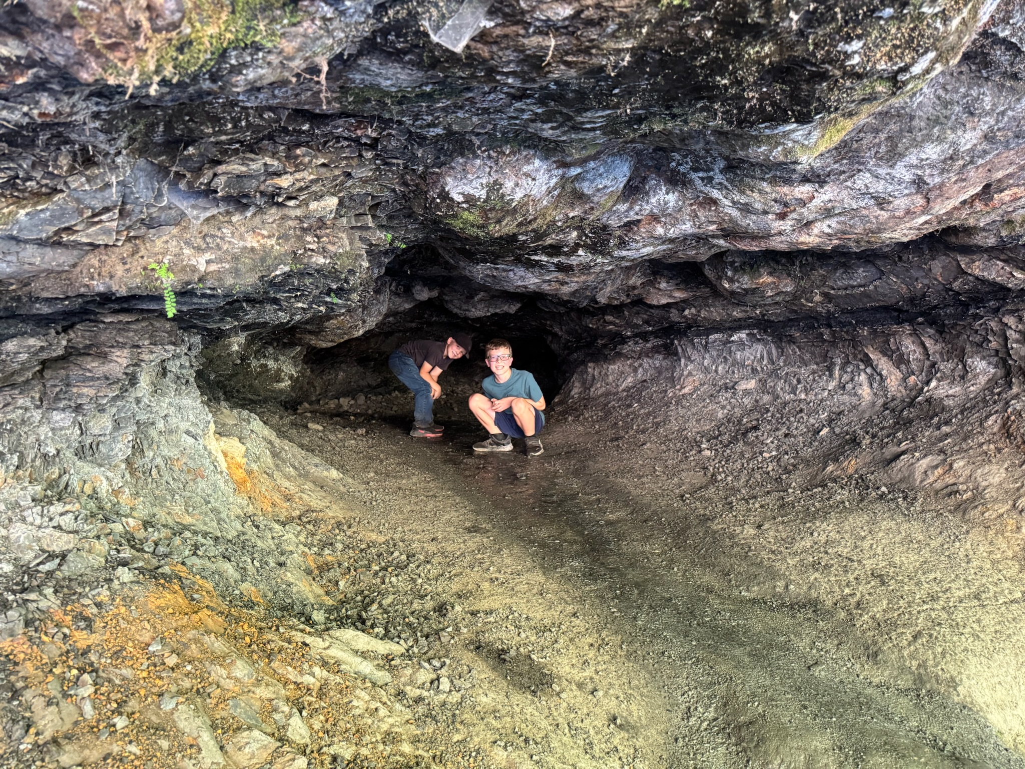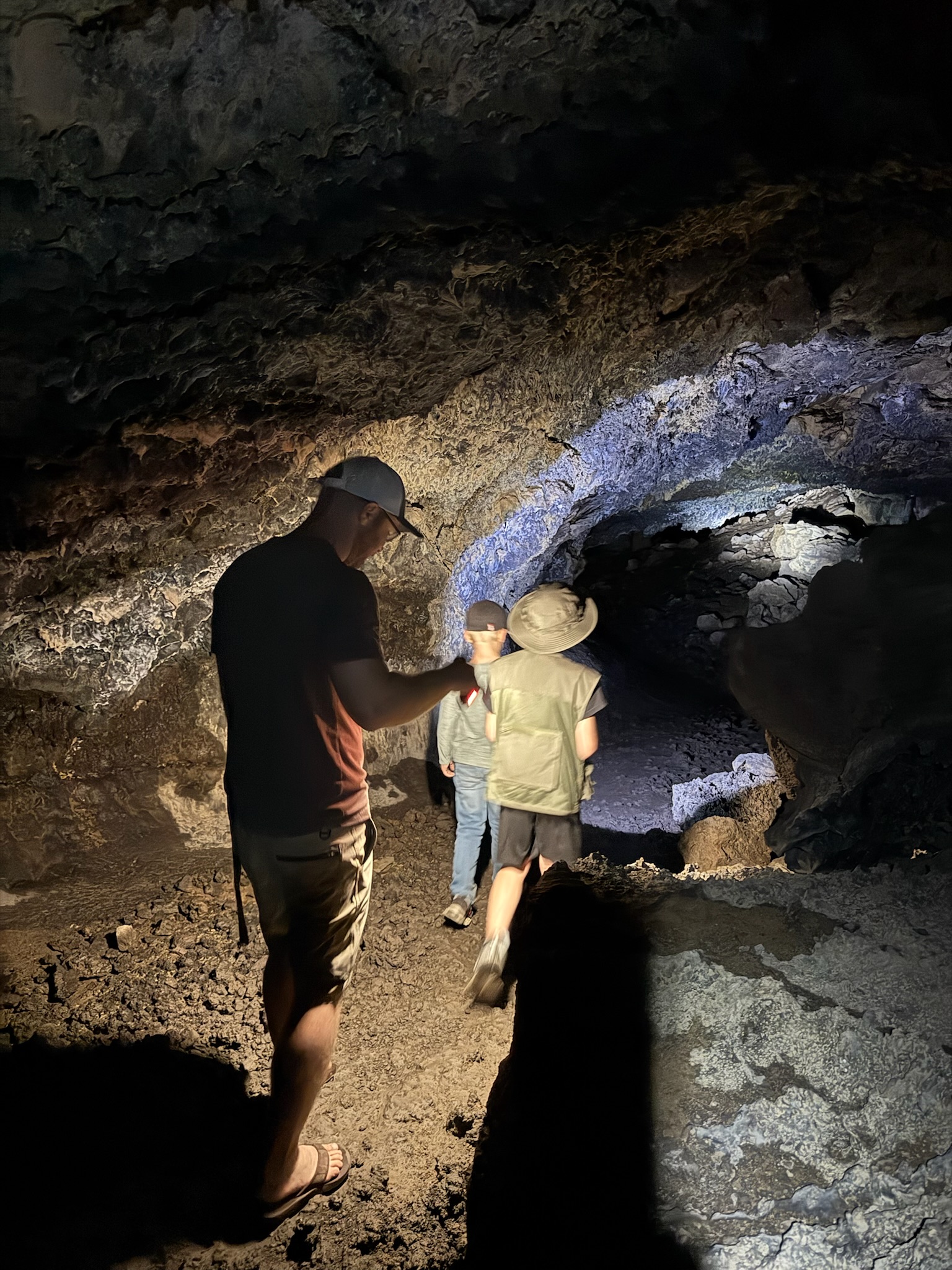 Once we made it to camp, we decided we had to go check out the cave! Another quarter-mile walk across the road led us back over to Subway Cave where we got to explore the cold, dark lava tube. It was a short walk through the cave, only about .3 miles to the other side where you could exit the cave and continue hiking outside, or turn back and walk back through the cave and out the way you entered. Of course, we all wanted to walk back through the cave because that was way cooler than being above ground! One thing to remember with lava tubes and caves, bring a jacket and a flashlight because it does get cold underground and very dark! We finished our travel day with dinner by the campfire and a homemade cobbler with the fresh black berries we picked in Lotus.