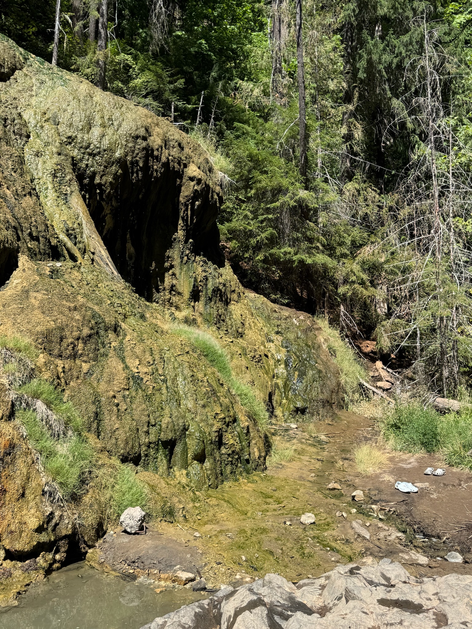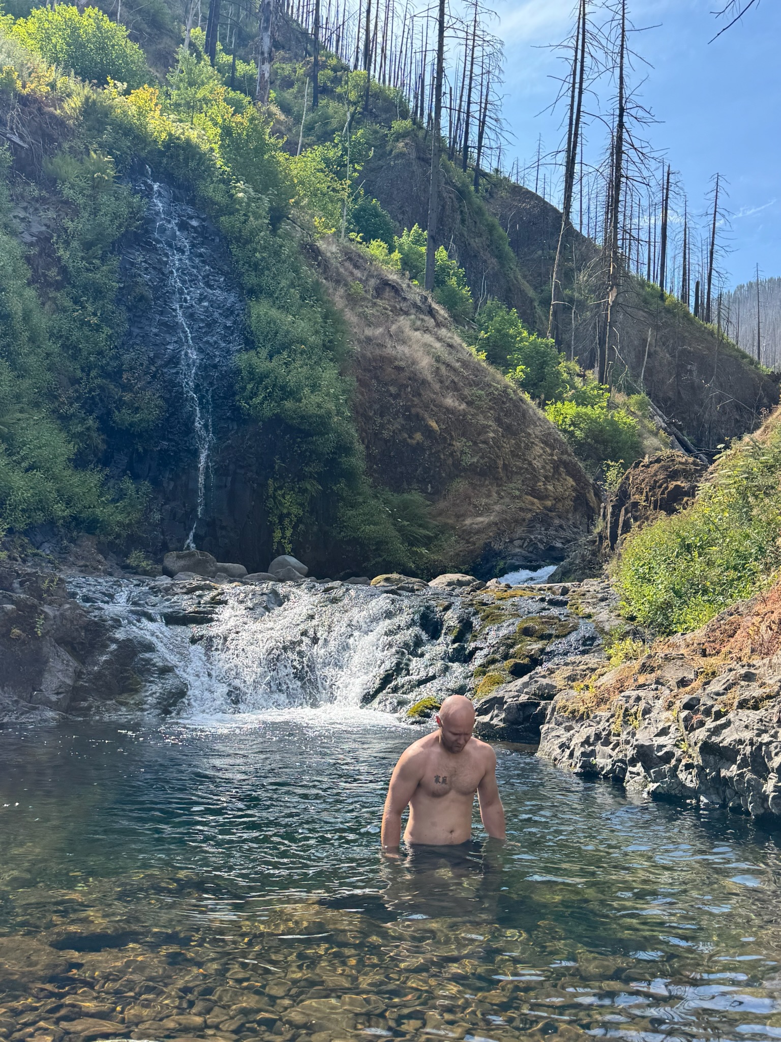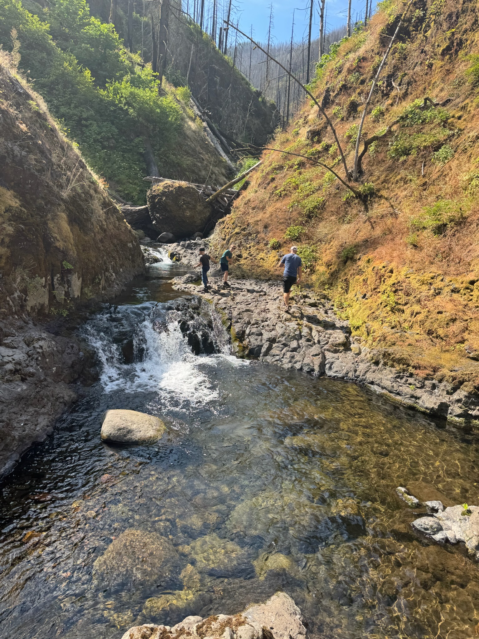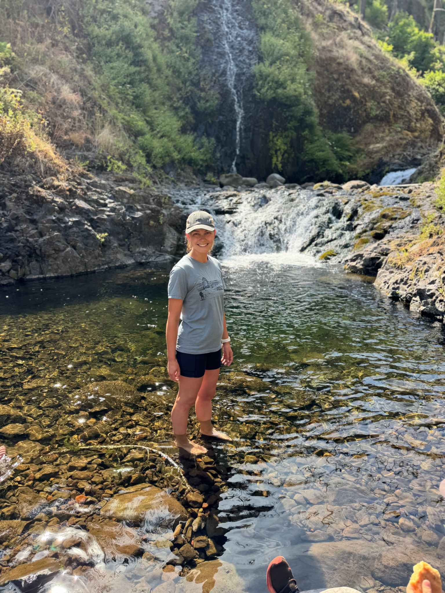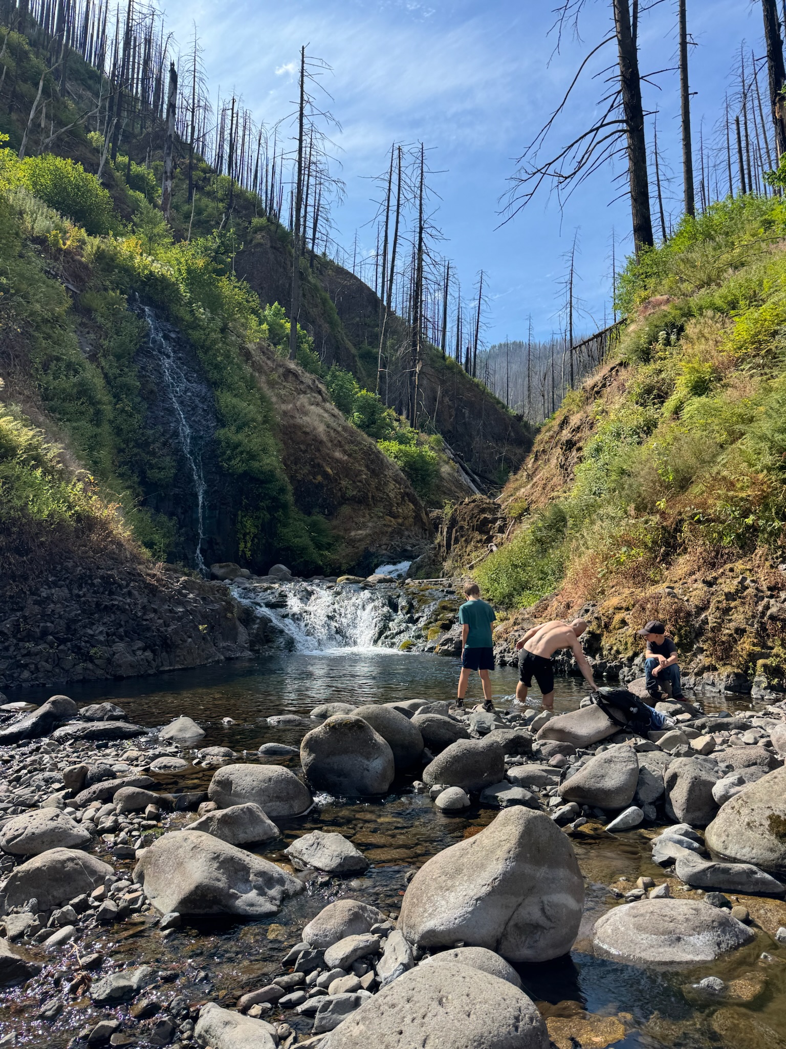 We walked down the hillside to the lower pool that was right next to the North Umpqua River. We decided to do a little more exploring instead of just stopping at the hot springs like most people do. We crossed the river to the other side- something that proved to be more challenging than it looked because the water was so freezing cold that by the time we reached the other side our feet and legs hurt with icy numbness! But it was worth it, because we found a neat little waterfall on the other side that was tucked behind trees and streaming down the mossy mountainside. We all took a drink from the fresh falling water before crossing back through the icy water and back up to the hot springs, which by this point, had many more people in them!