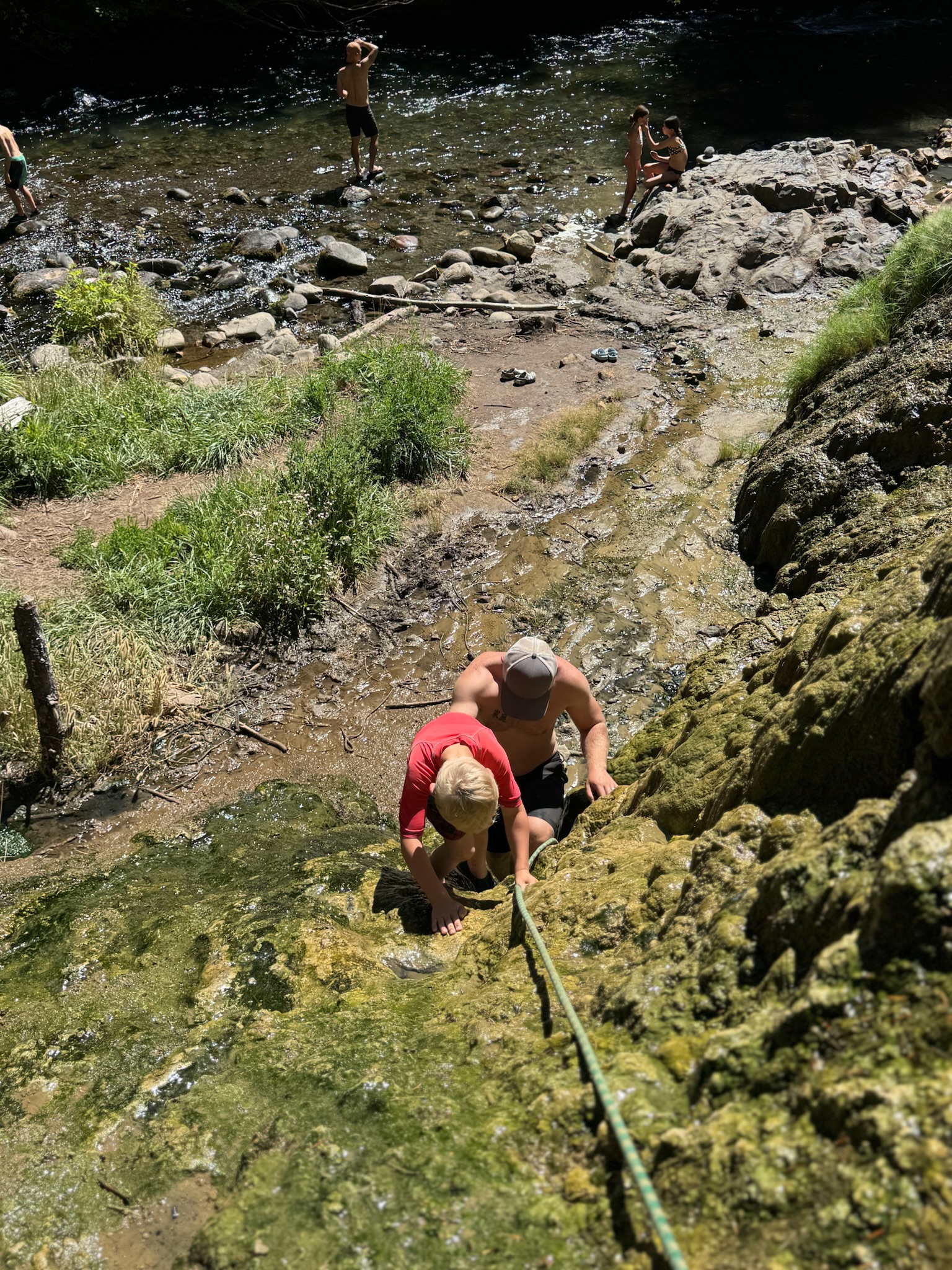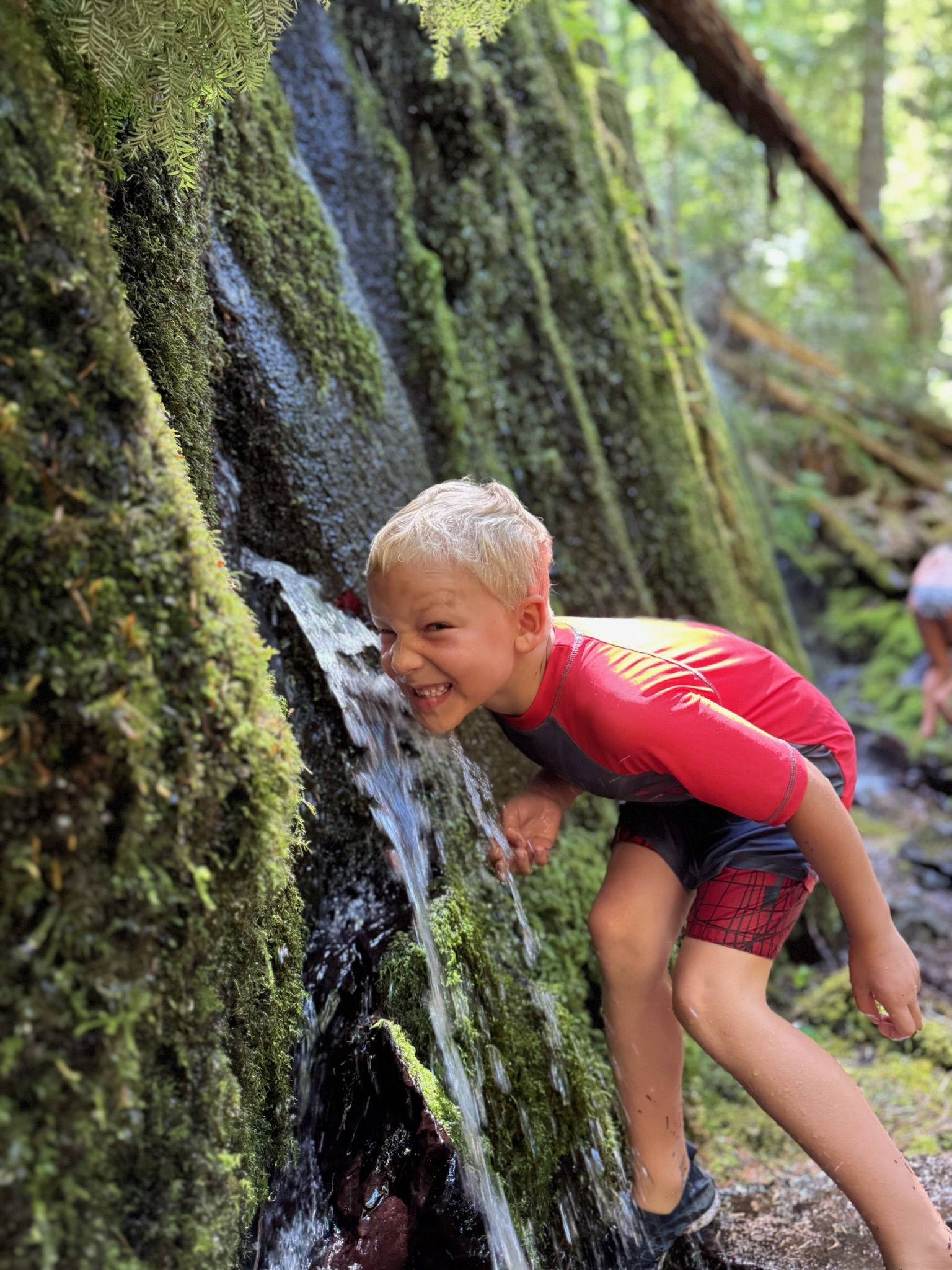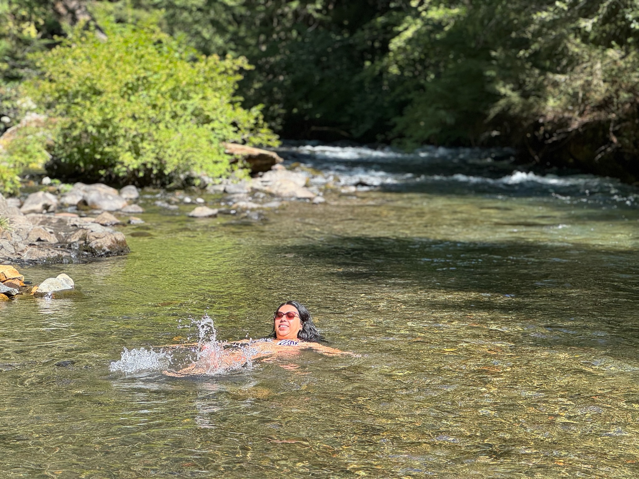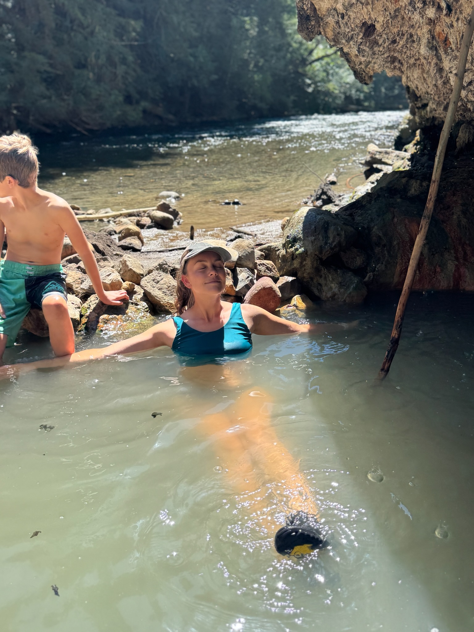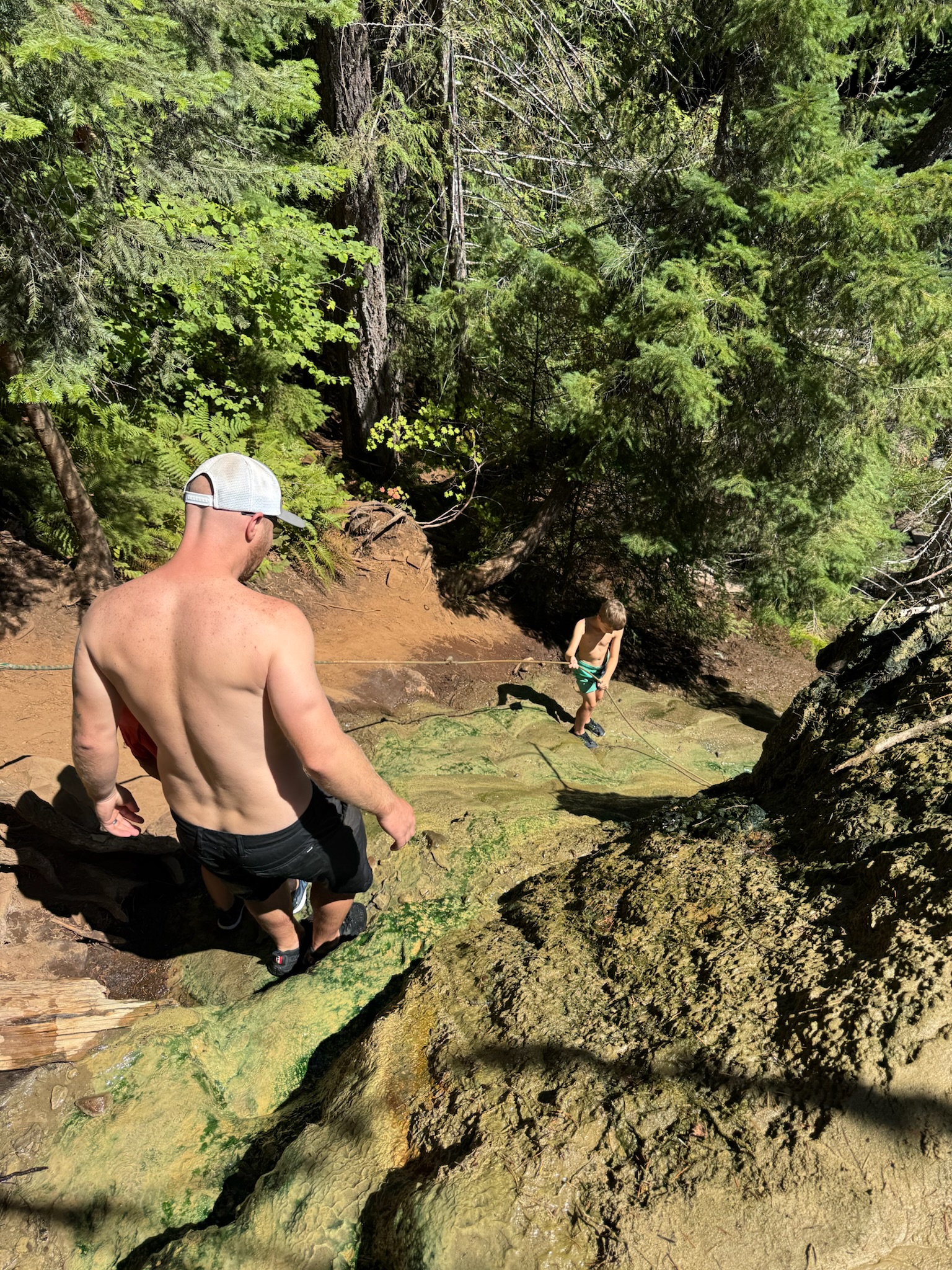 We walked down the hillside to the lower pool that was right next to the North Umpqua River. We decided to do a little more exploring instead of just stopping at the hot springs like most people do. We crossed the river to the other side- something that proved to be more challenging than it looked because the water was so freezing cold that by the time we reached the other side our feet and legs hurt with icy numbness! But it was worth it, because we found a neat little waterfall on the other side that was tucked behind trees and streaming down the mossy mountainside. We all took a drink from the fresh falling water before crossing back through the icy water and back up to the hot springs, which by this point, had many more people in them!
