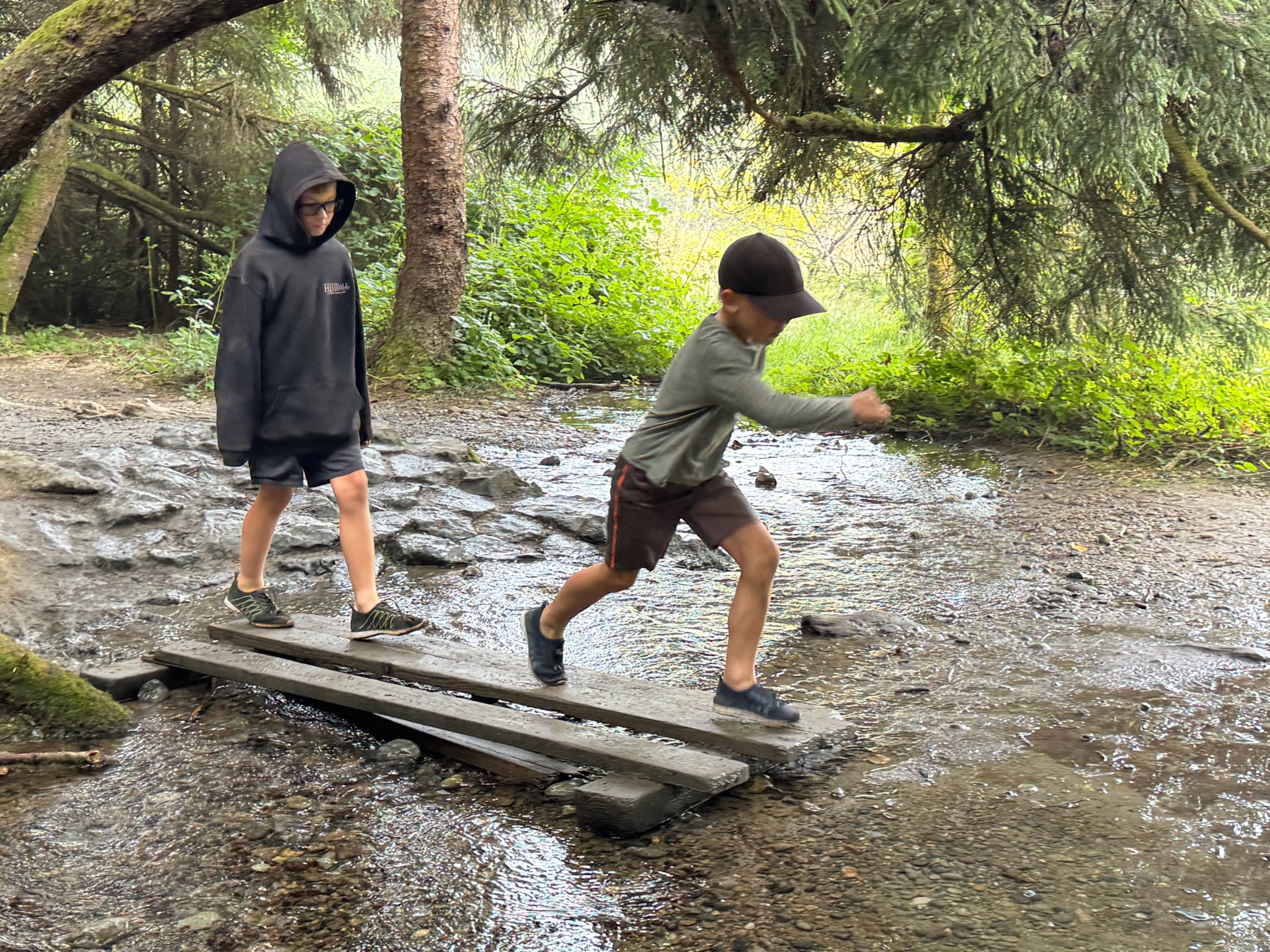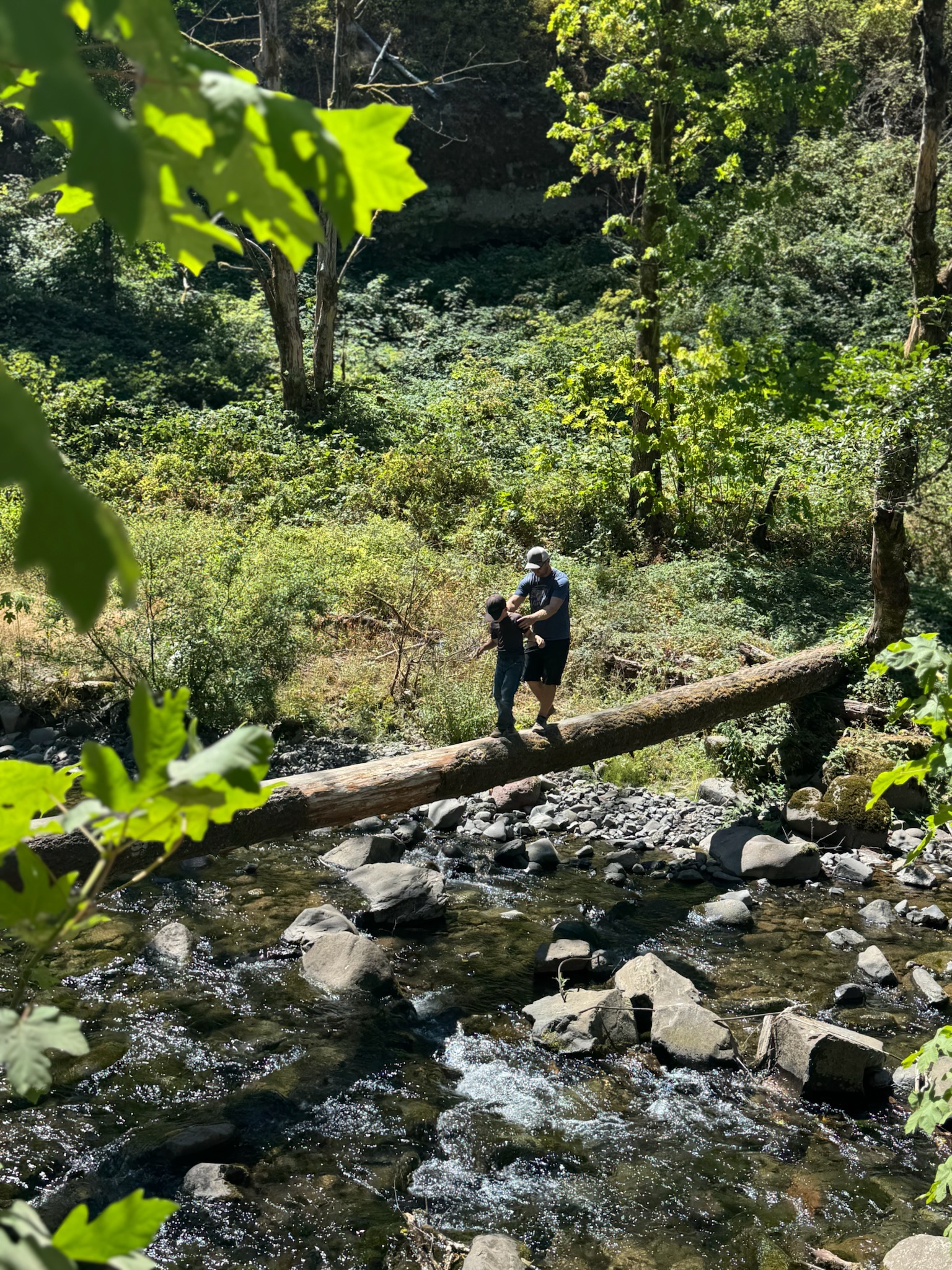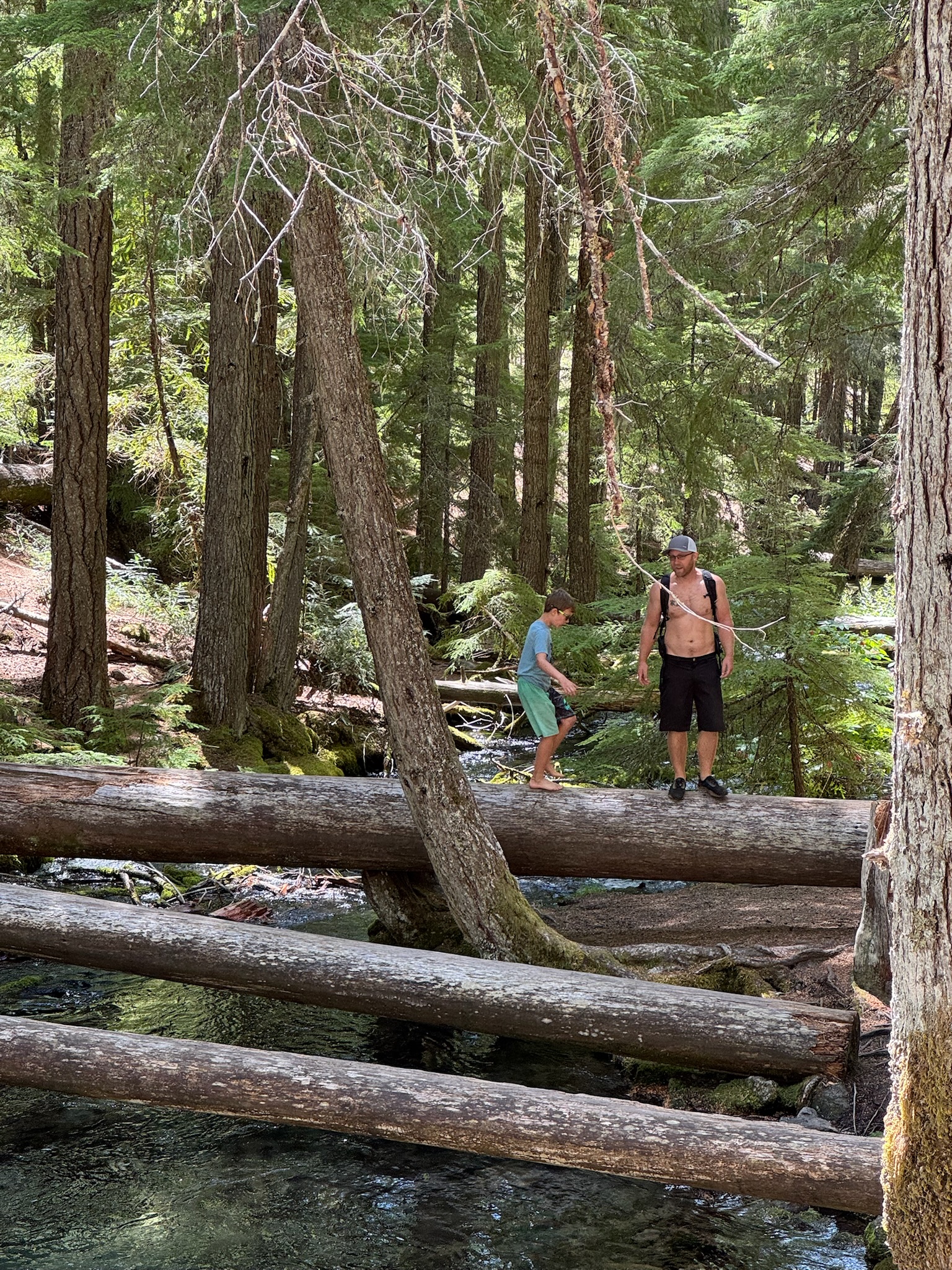 After setting up camp, we walked down to the creek and quickly noticed a bridge crossing over the water where we found a single-track trail that paralleled the creek. The kids loved this narrow trail and enjoyed rock hopping around the creek and climbing on fallen trees. We hiked the serene little trail for a long while before crossing a fallen tree back to the other side and trekked back to camp.