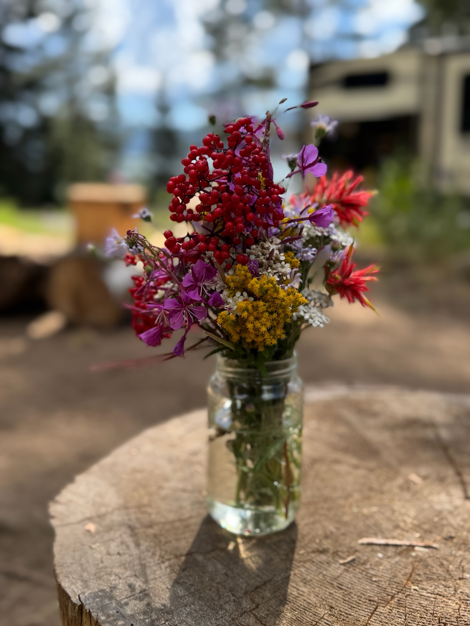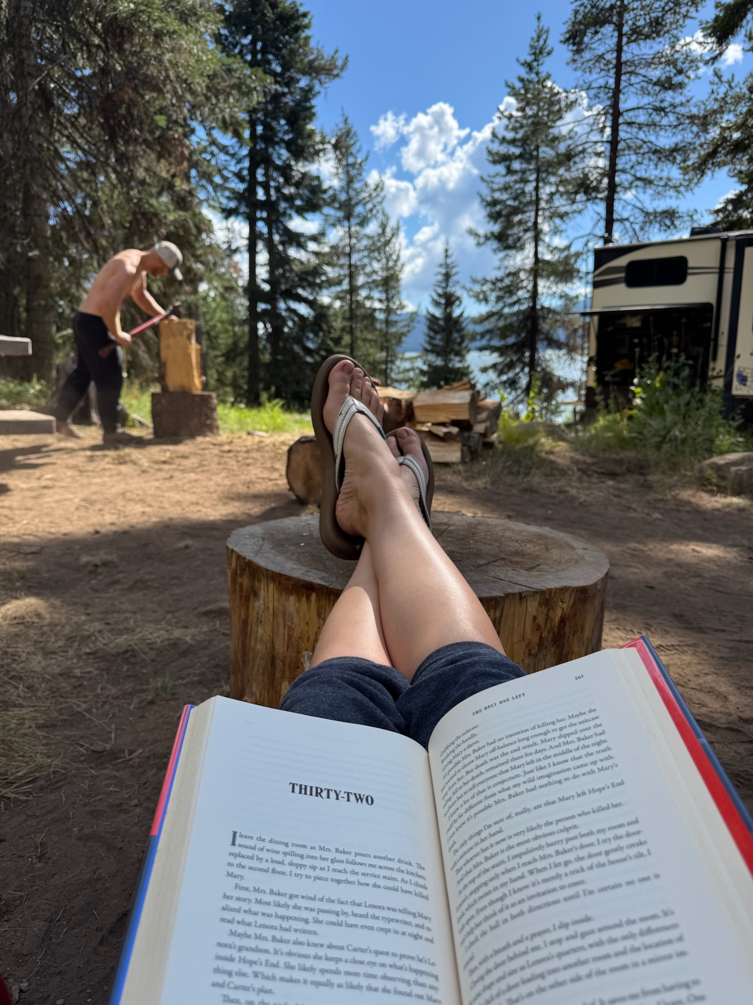 The campground was very spread out, not a lot of other campers, and we were right on the lake. It was beautiful! Honestly, every stop on our trip thus far had been great and we weren’t disappointed with any of them! As usual, after setting up camp, we did a little exploring of the campground and went for a bike ride down the road to the nearby convenience store and back. We finished the day with collecting wild flowers, reading, and chopping wood (with Dustin’s new axe), since there was an abundance of stump rounds around the campsite! We enjoyed a BBQ dinner and roasted individual berry pies with our wolf’em sticks around the campfire.