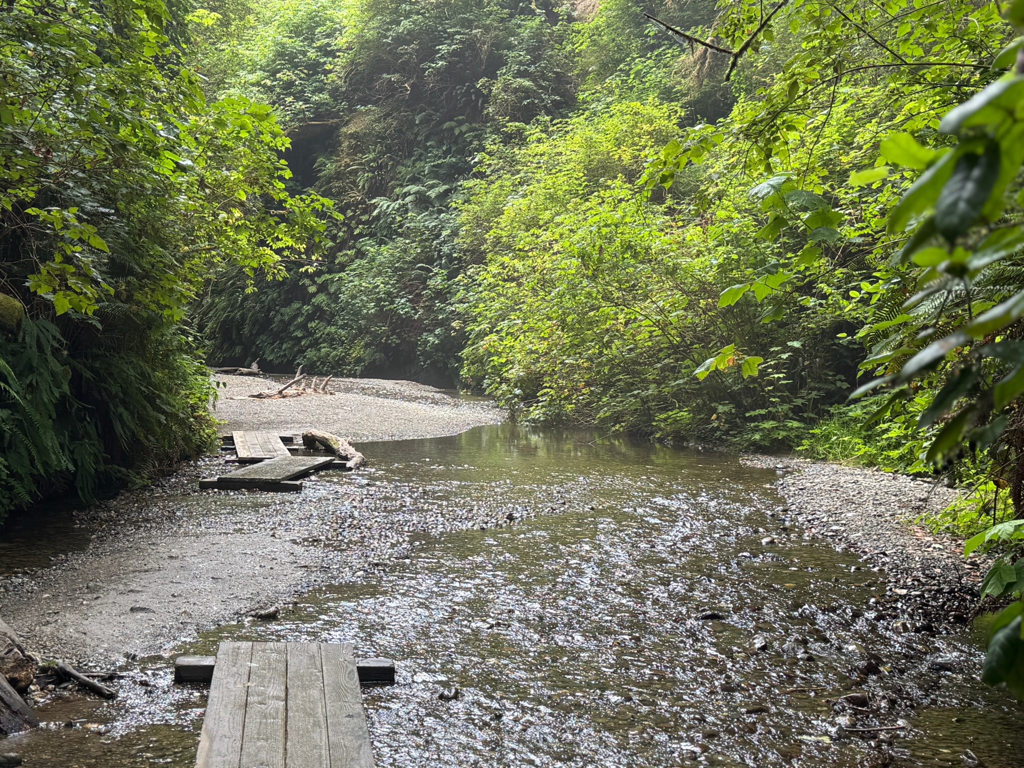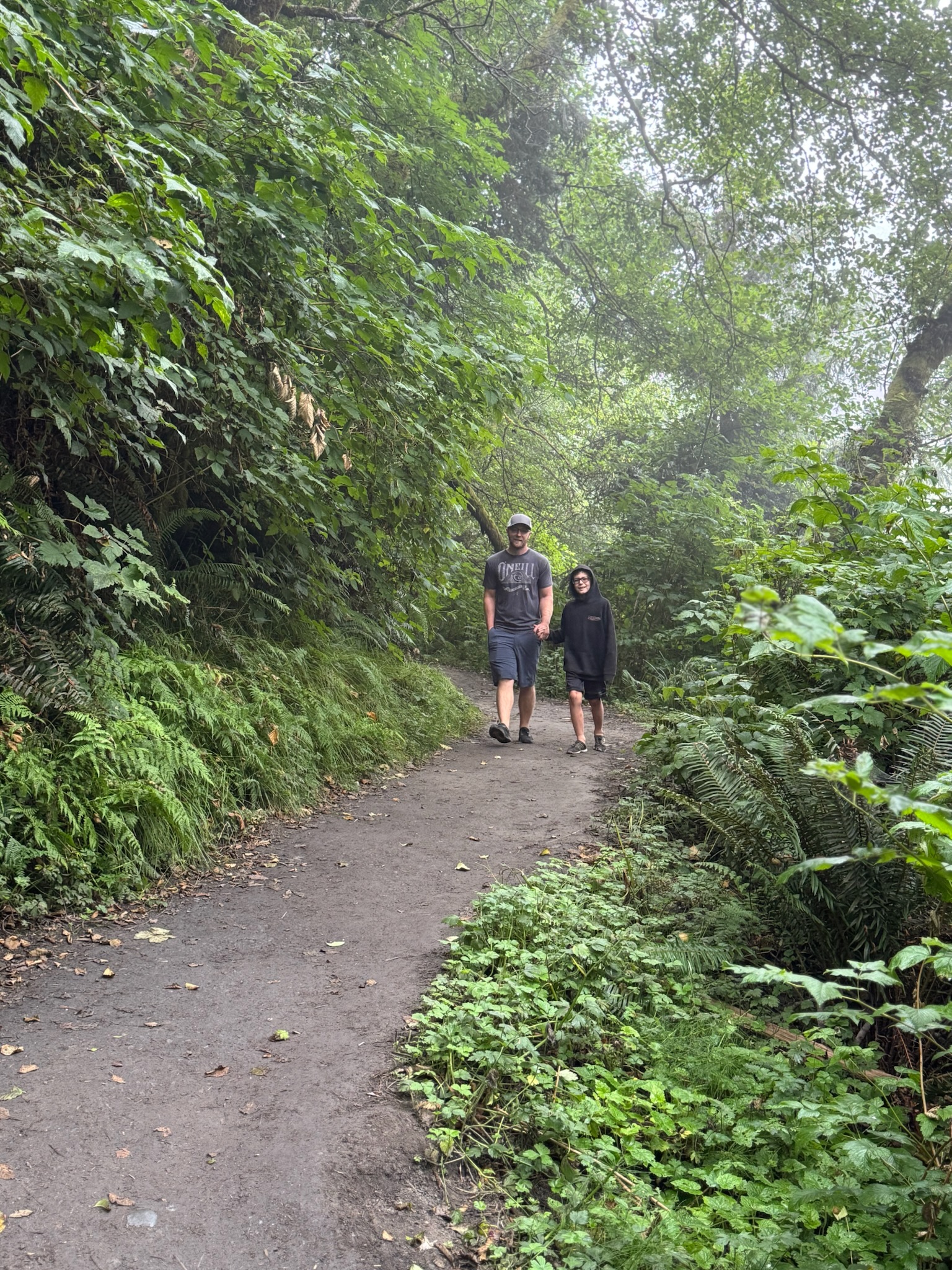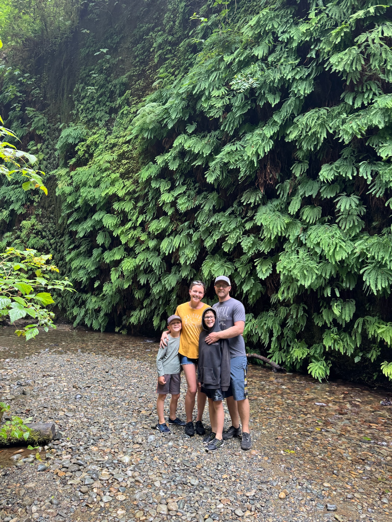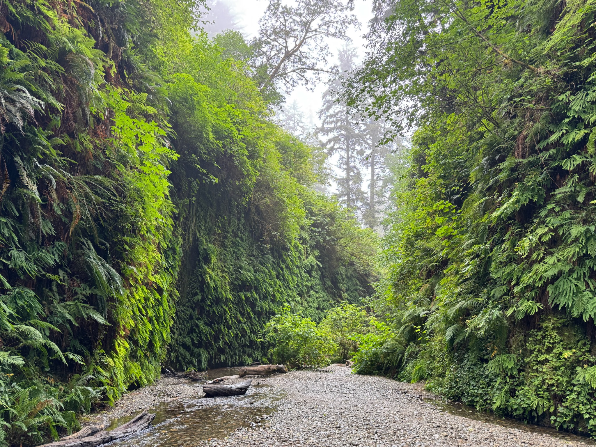 The access to the canyon is right off 101 (and was actually the very next turn from our campsite), but then it takes a winding dirt road for 7 miles before you reach the parking area for the trailhead, so even though the trail was very close, it still took us about 30 minutes to drive there. The trail starts out walking through the forest on a well-maintained path and, though still a beautiful green forest, looks pretty similar to other hikes through the woods. But then, as you get to the canyon part, wow! It’s like you’re walking through a creek bed, with water in some areas and dry rock bed in others, and the walls just tower above you and are covered with beautiful lush green ferns!