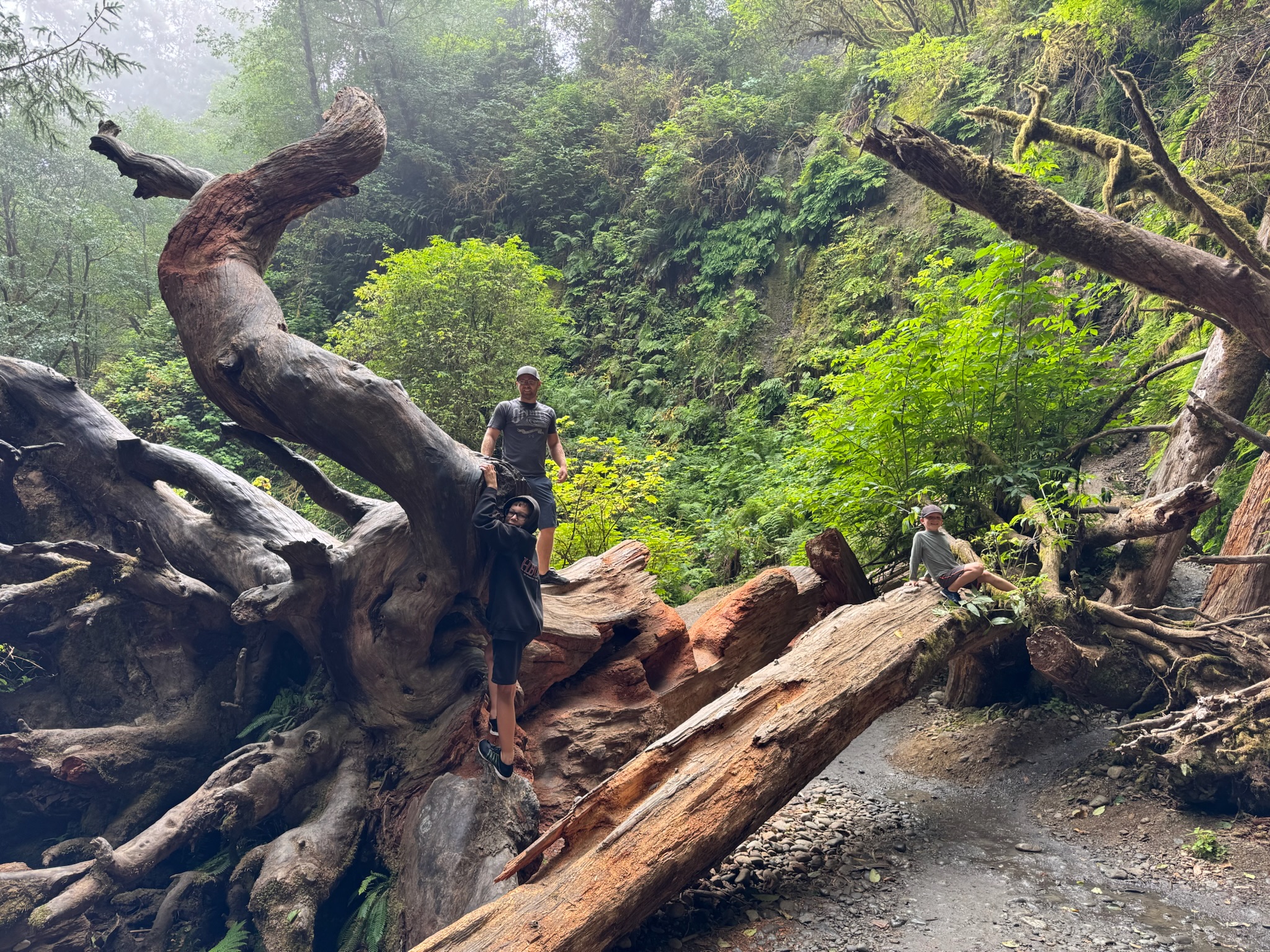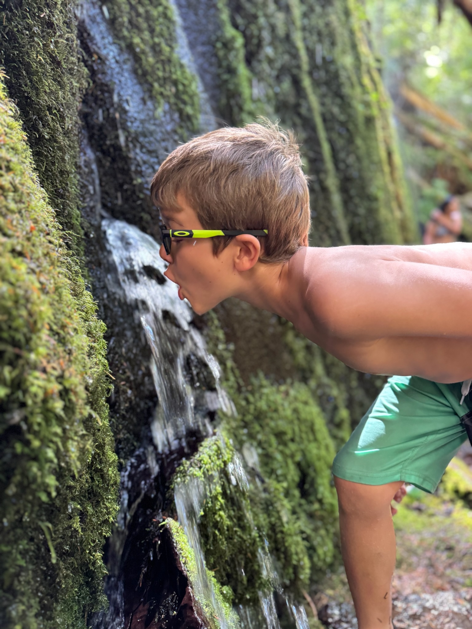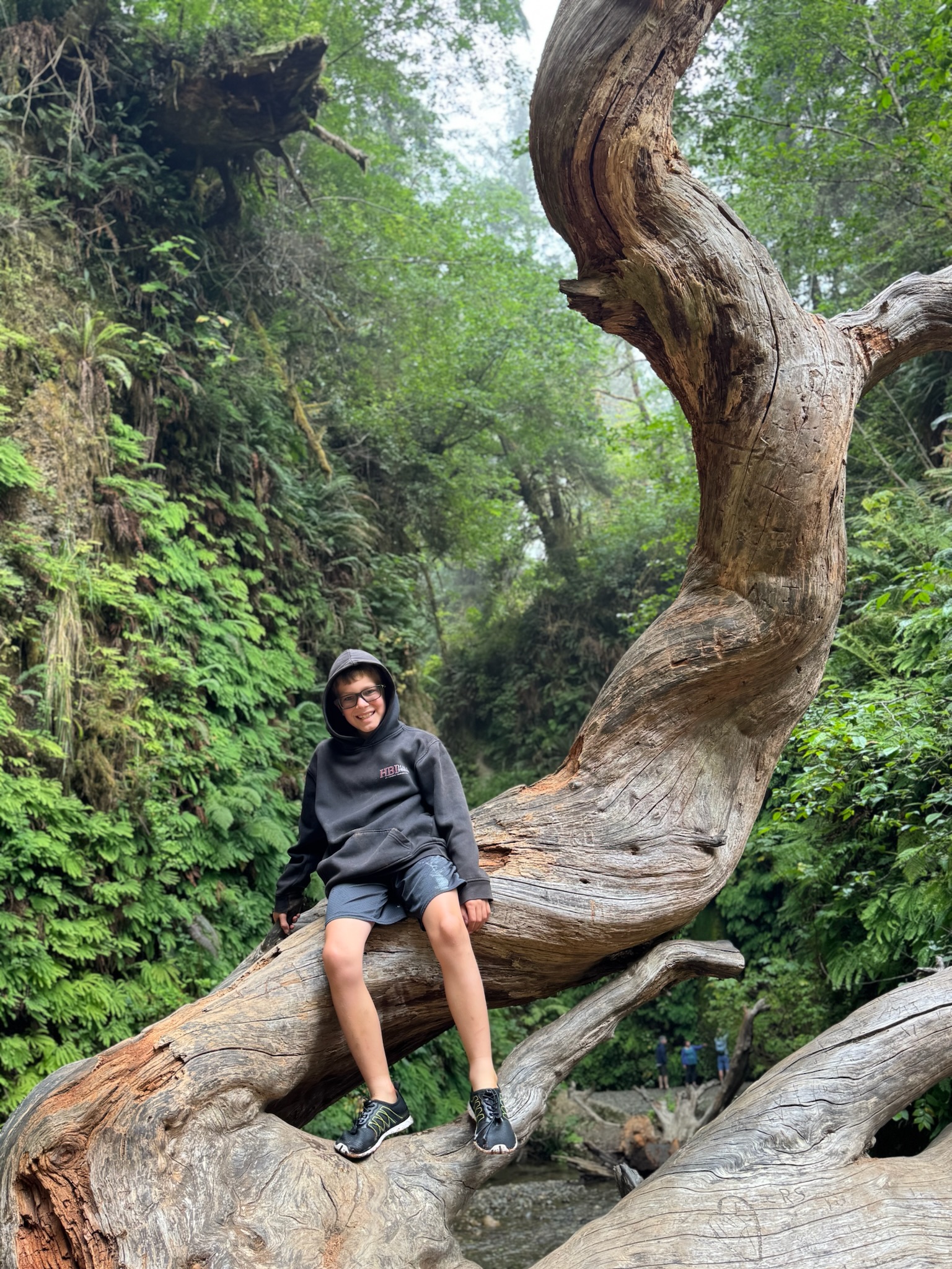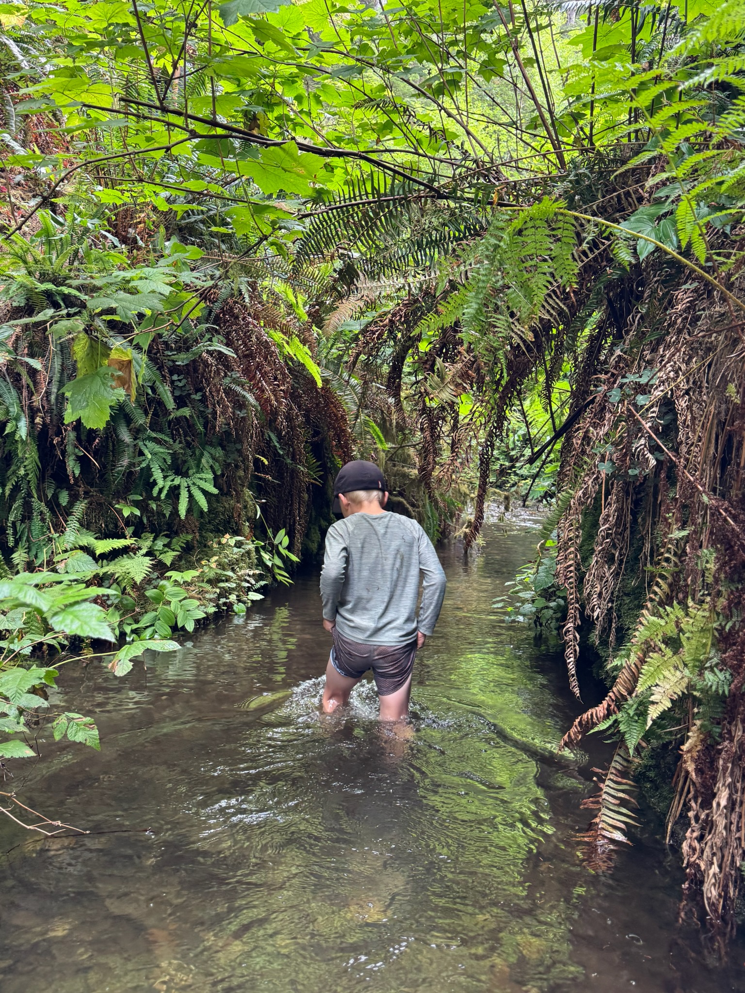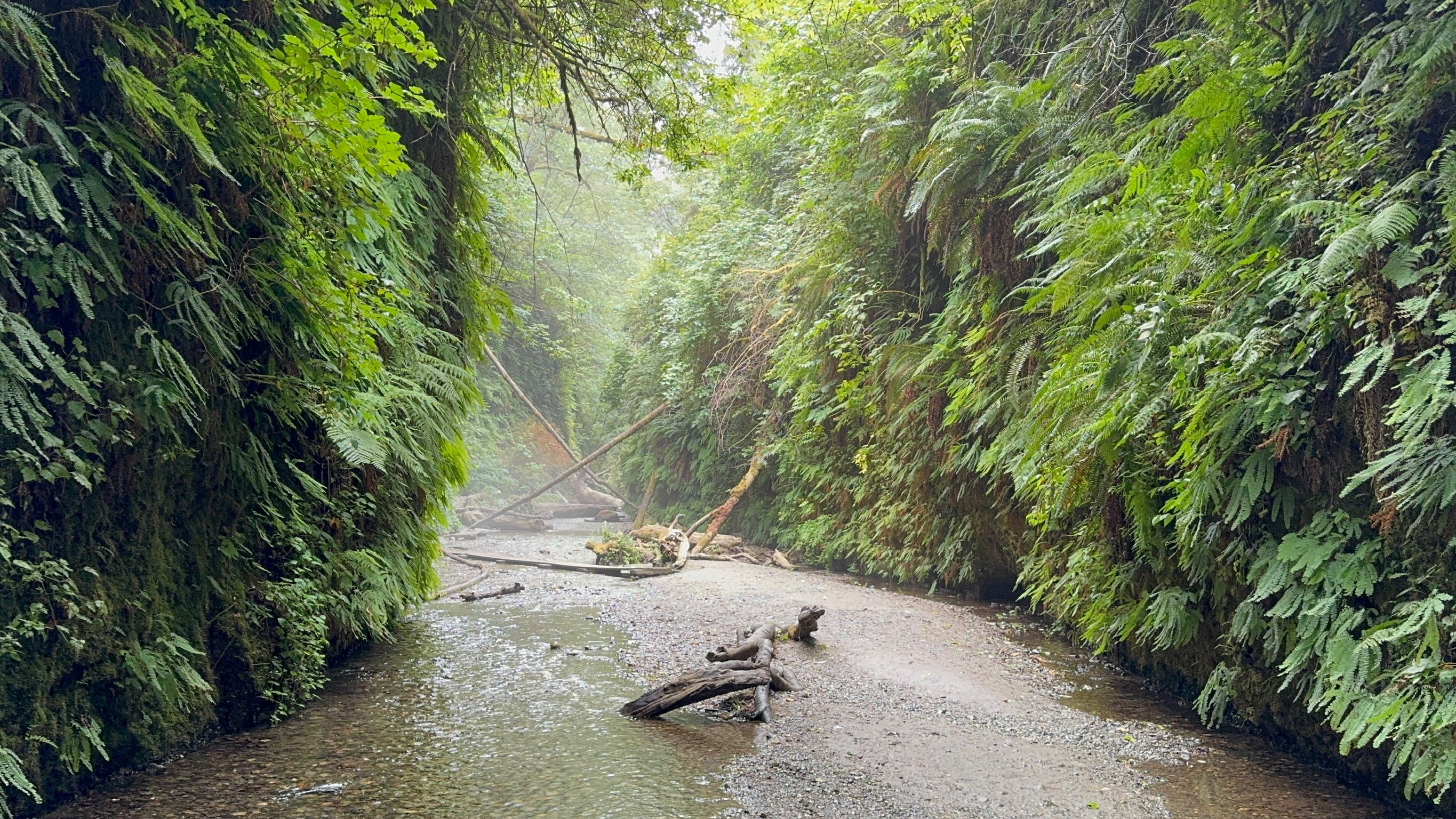 The access to the canyon is right off 101 (and was actually the very next turn from our campsite), but then it takes a winding dirt road for 7 miles before you reach the parking area for the trailhead, so even though the trail was very close, it still took us about 30 minutes to drive there. The trail starts out walking through the forest on a well-maintained path and, though still a beautiful green forest, looks pretty similar to other hikes through the woods. But then, as you get to the canyon part, wow! It’s like you’re walking through a creek bed, with water in some areas and dry rock bed in others, and the walls just tower above you and are covered with beautiful lush green ferns!