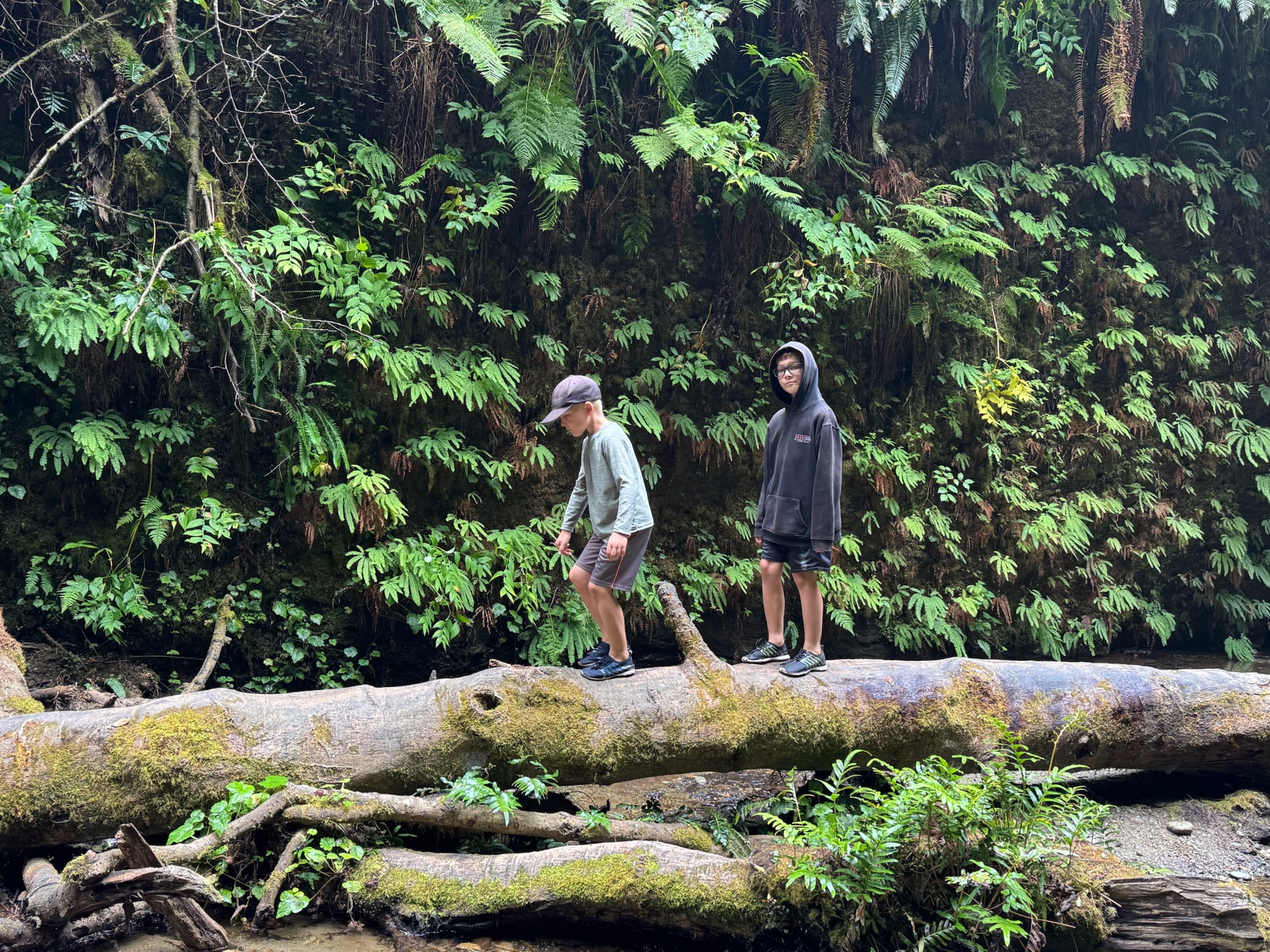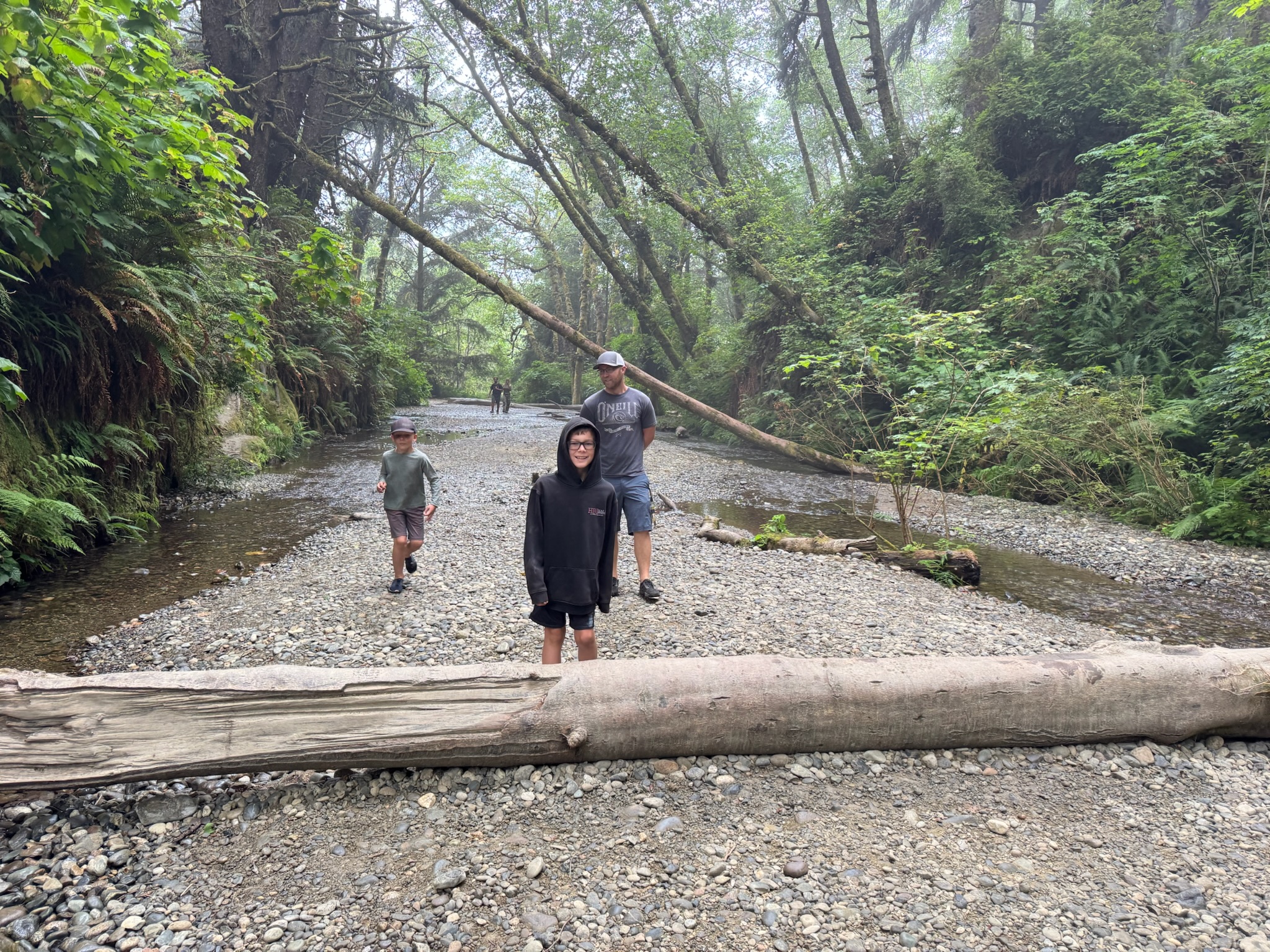 Our next campsite was just another 30 minutes past the Trees of Mystery. This was the first site on our whole trip that we were not crazy about, but I chose this location because it was a good driving distance, being not overly far, and it was close to Fern Canyon, which I was very excited to check out! Plus, there just wasn’t a lot of campgrounds available in this whole area on the coast. We pulled off of 101 and onto the campground. The 6-acre property sunk a little lower than the highway and was surrounded by black berry bushes along the highway side (and yes, we picked a bunch again!) and Prairie Creek on the other side. The campground was fairly small, only allowing a handful of RVs (full hook up) along with a couple cottages and vacation homes. There wasn’t much area to explore being that we were right off the highway on one side, but on the creek side, Dustin decided to pull out the fishing poles again and give it a shot! Him and the boys were able to catch a few small fish before we settled in with some card games for the night.