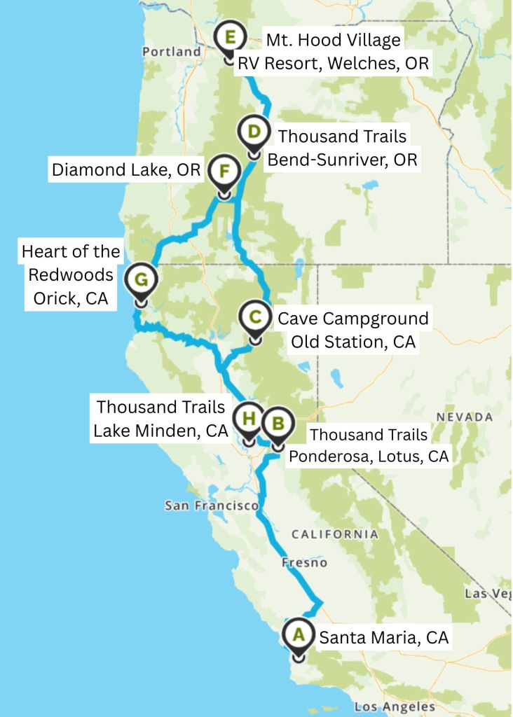 We had a long way to go and a deadline to get there, so we made our first stretch of driving a long one, driving nearly 6 hours to Lotus, CA. We chose the Ponderosa Thousand Trails campground because: One, we are Thousand Trails members so the campsites are free, and two, because we had family nearby the area so we could make the most of our visit.