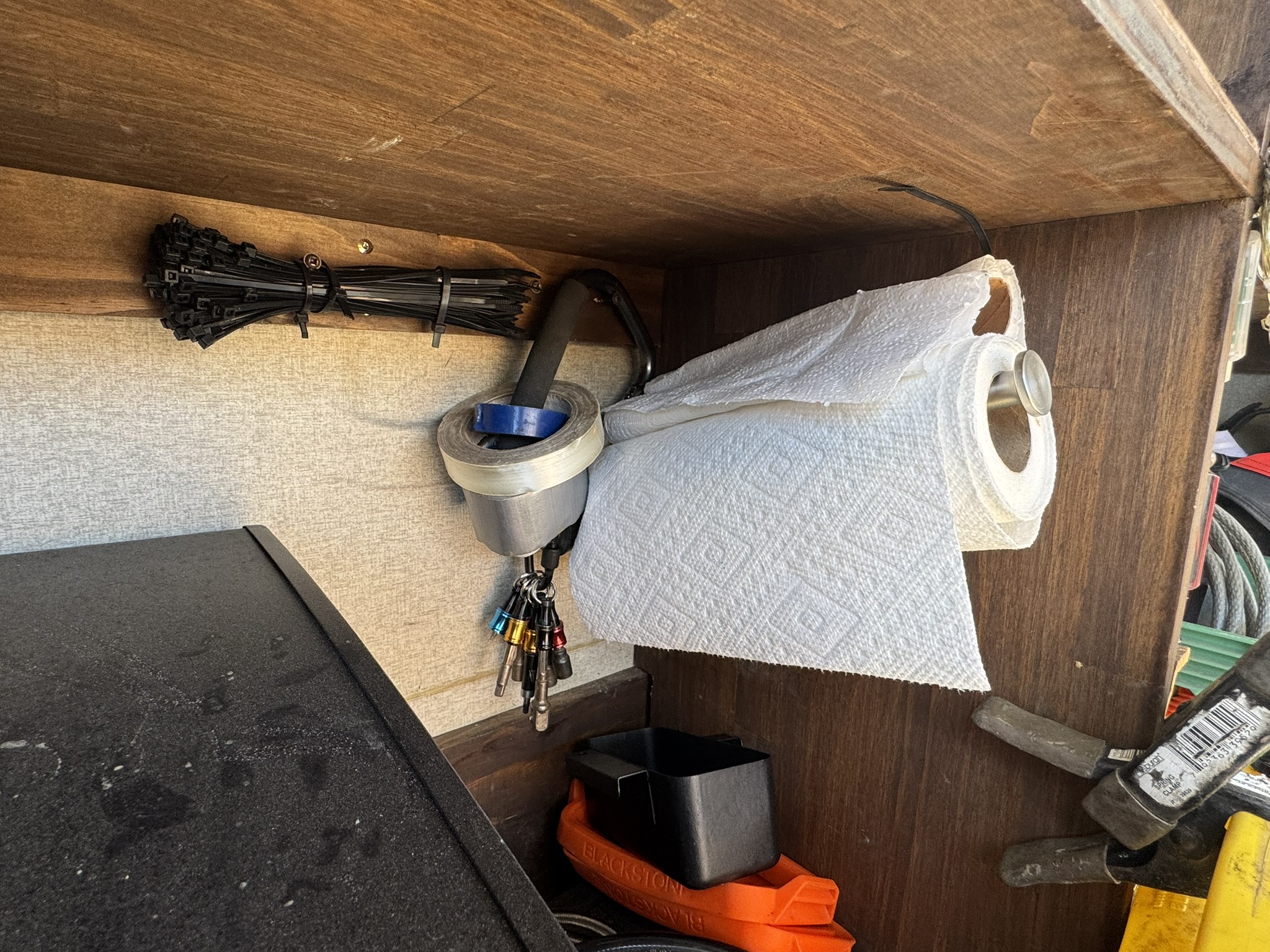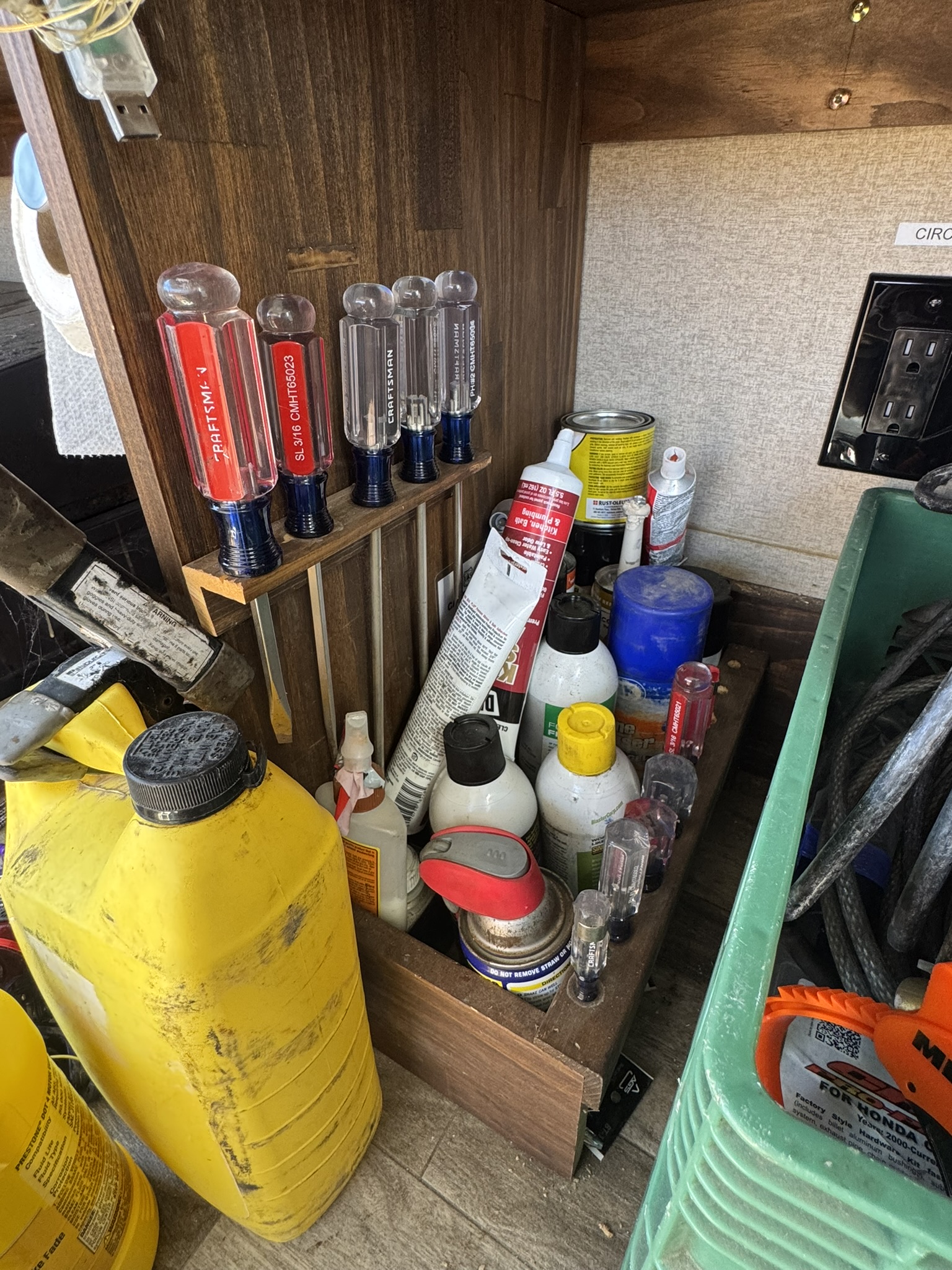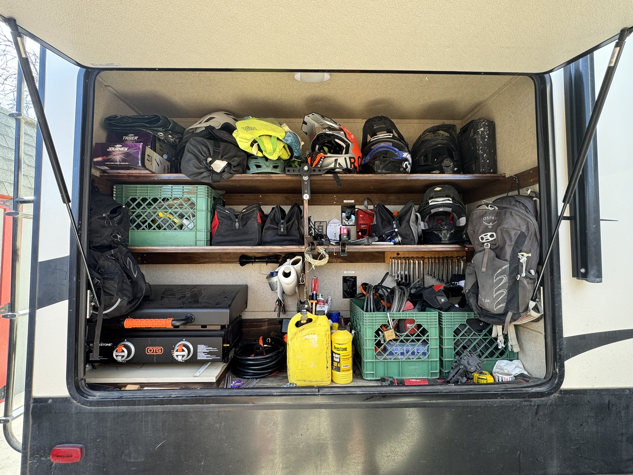We dirt bike often, and Dustin brings tools. We carry helmets, riding gear, oils, lubricants, extra plumbing supplies, and all the random “RV life” items that add up quickly.